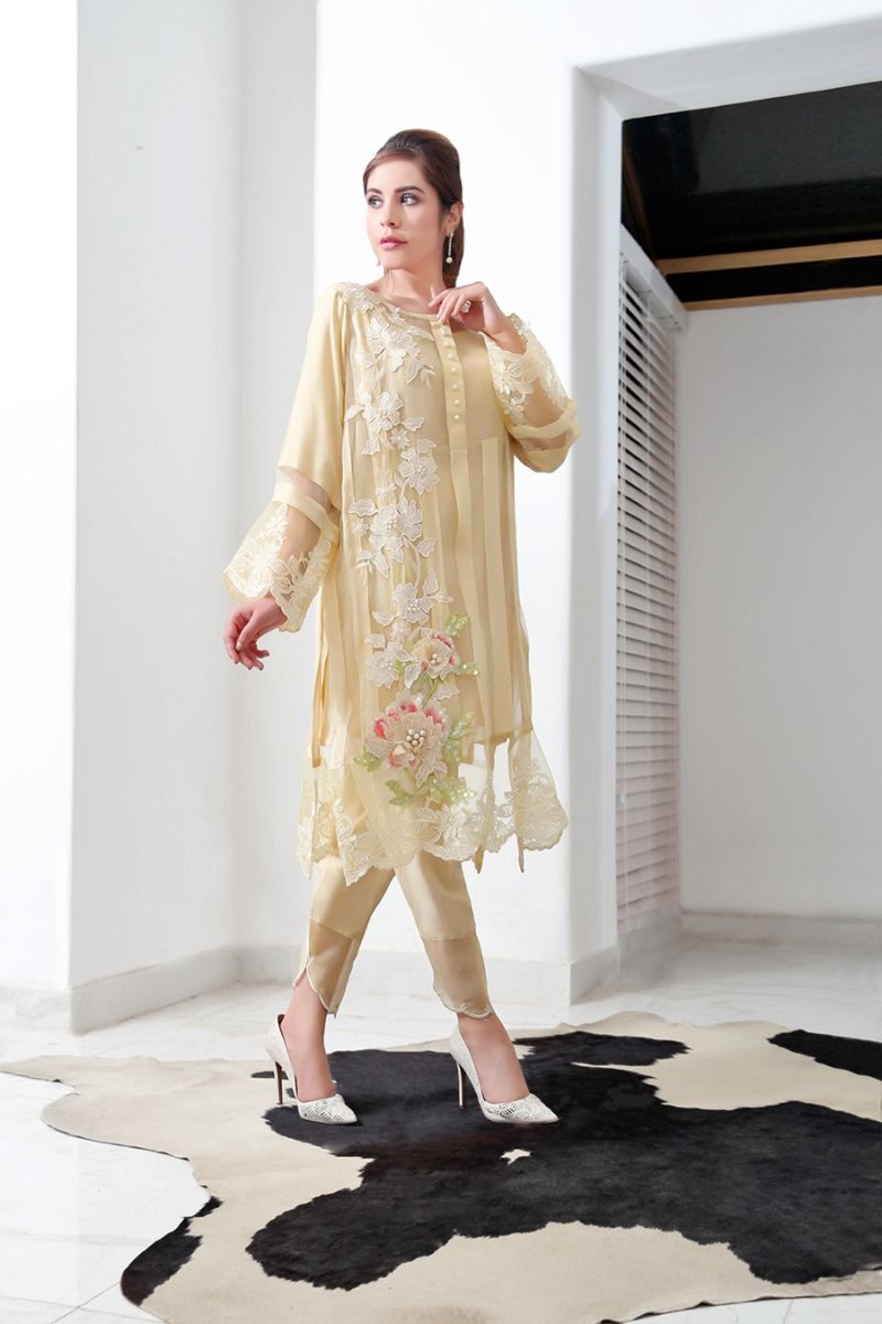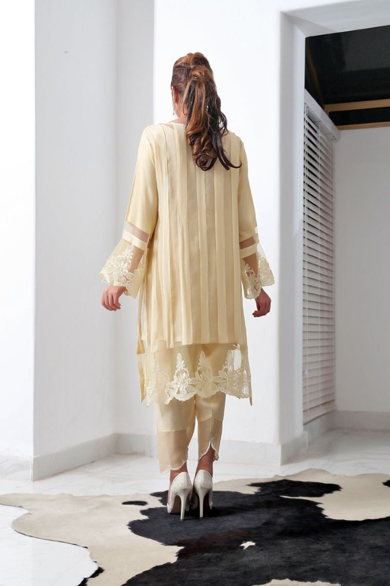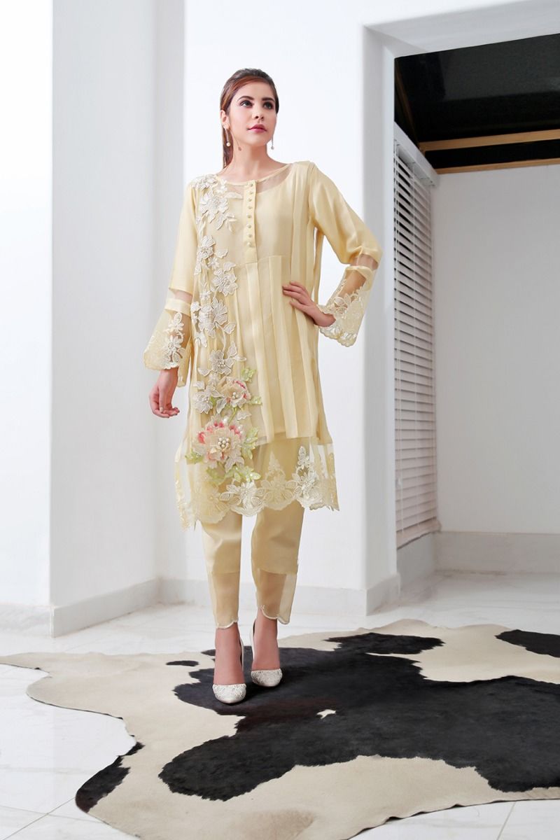 Three piece outfit; shirt, slip, trousers. Material is cotton net and organza.