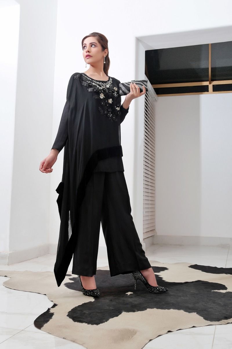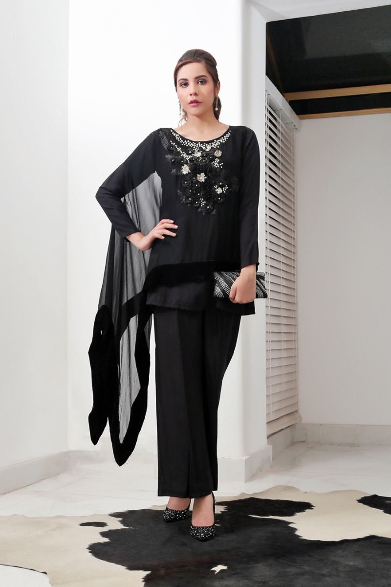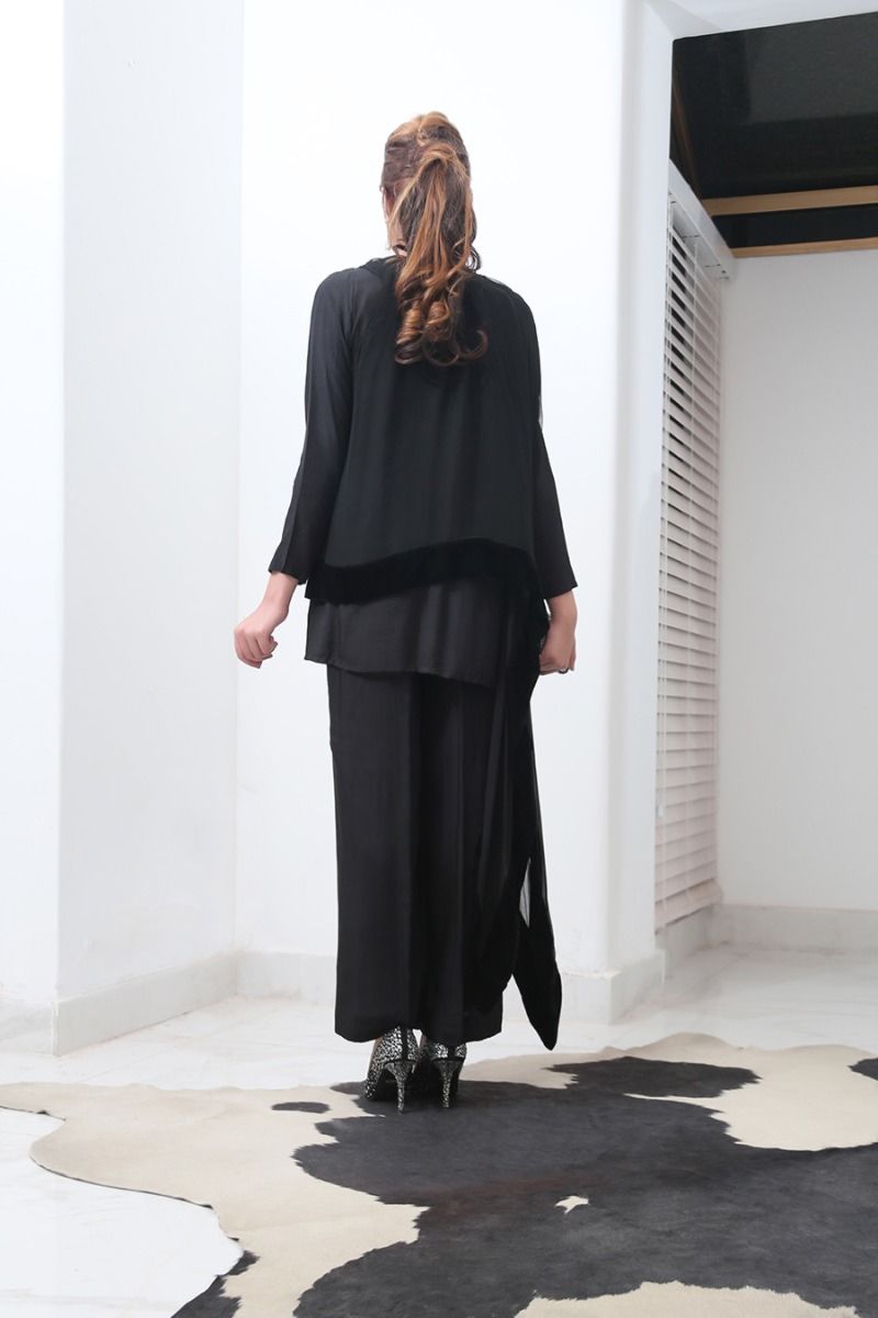 Three piece outfit; shirt, slip, trousers. Material is chiffon and grip.