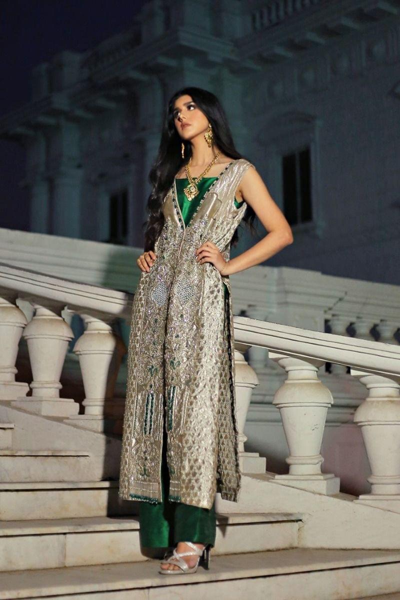 This timeless ensemble is dripping in emerald green raw silk paired with a striking silver tissue cape that is drenched in delicately placed crystals and stones. Parts: Top, bottom, cape
