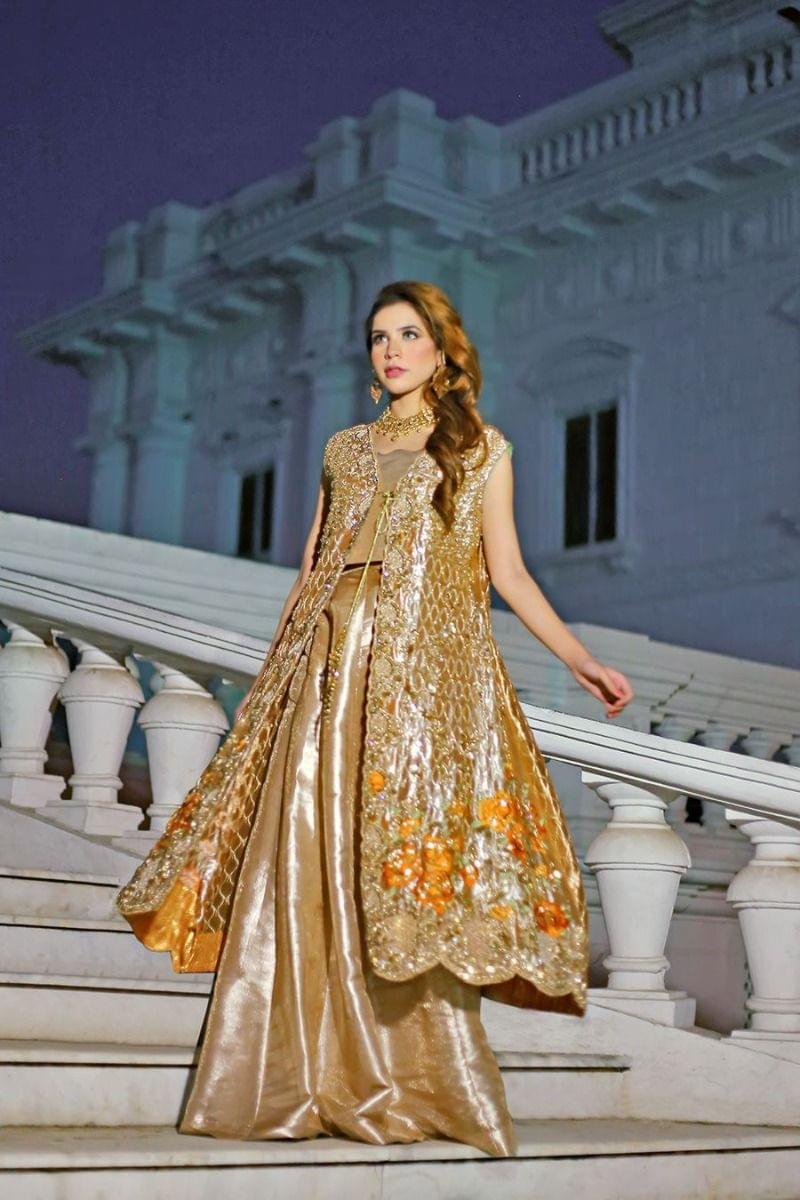All that glitters is truly gold! Our bold gold ensemble looks straight out of a fairytale. A shiny pale raw silk choli and lehnga that can slip though your hands, paired with an absoultely deliciously hand and machine crafted tissue cape. Delicately and precisely embellished with sequins, crystals and 3D floral elements. Parts: Top, Bottom, tissue cape