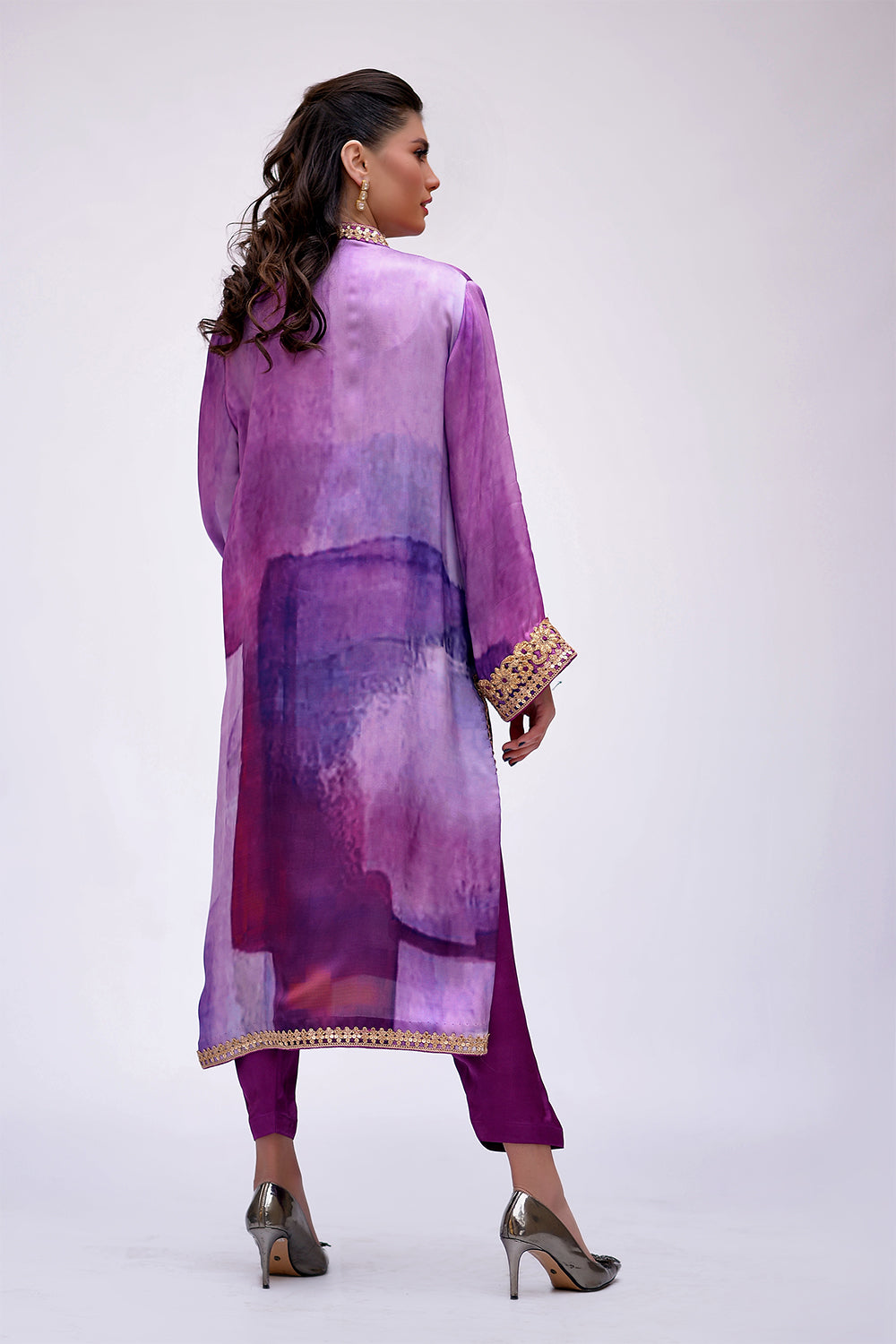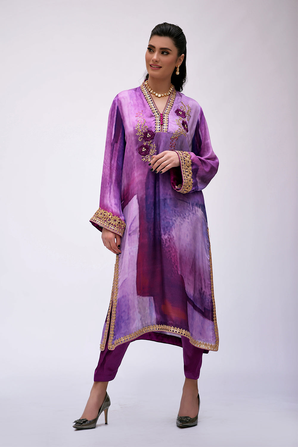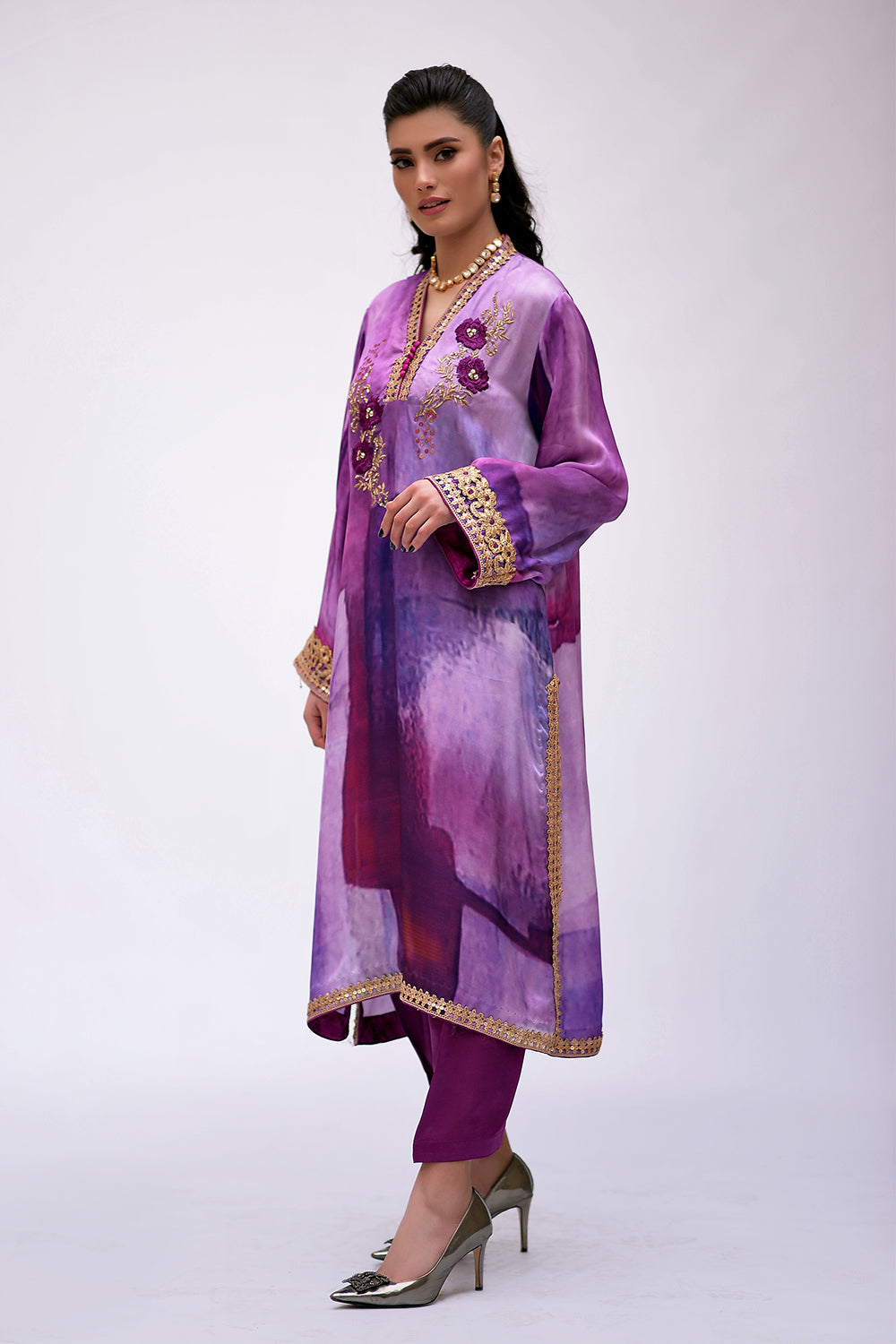 3 Piece suit, screen printed pure silk fabric with crushed dupatta embellished with tilla,dapka and zero sizes sequence, And Swarovski work.