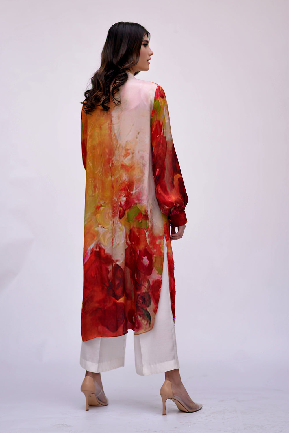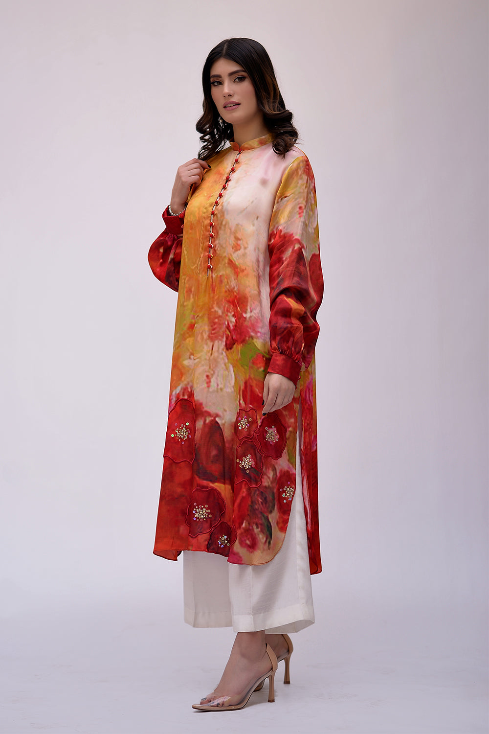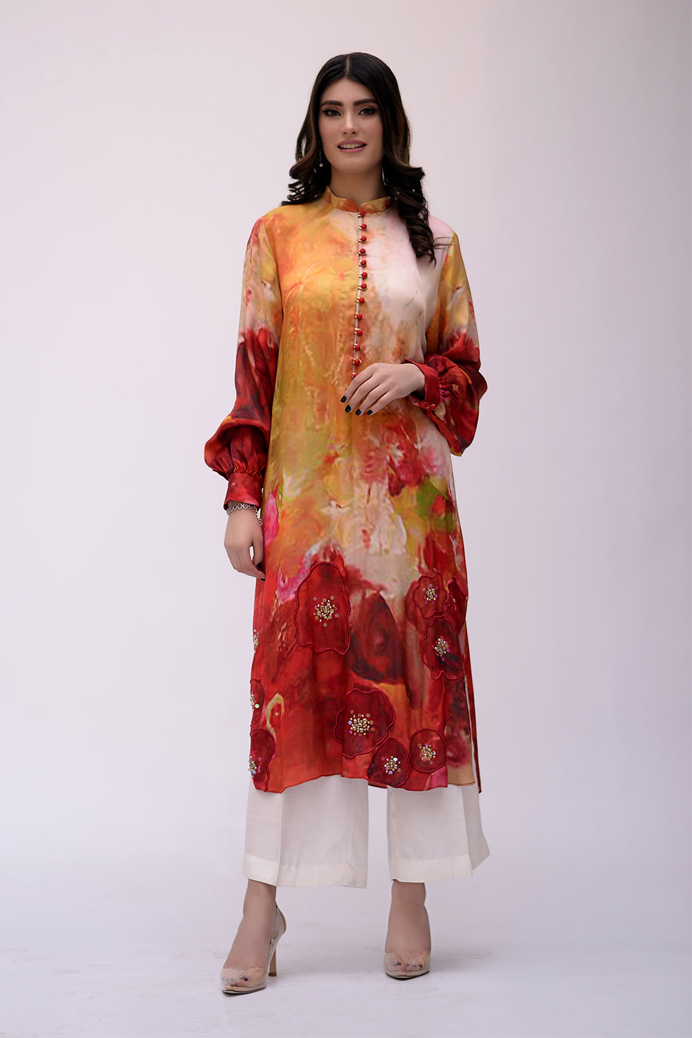 3 Piece suit, screen printed pure silk fabric with crushed dupatta embellished with tilla,dapka and zero sizes sequence, And Swarovski work.
