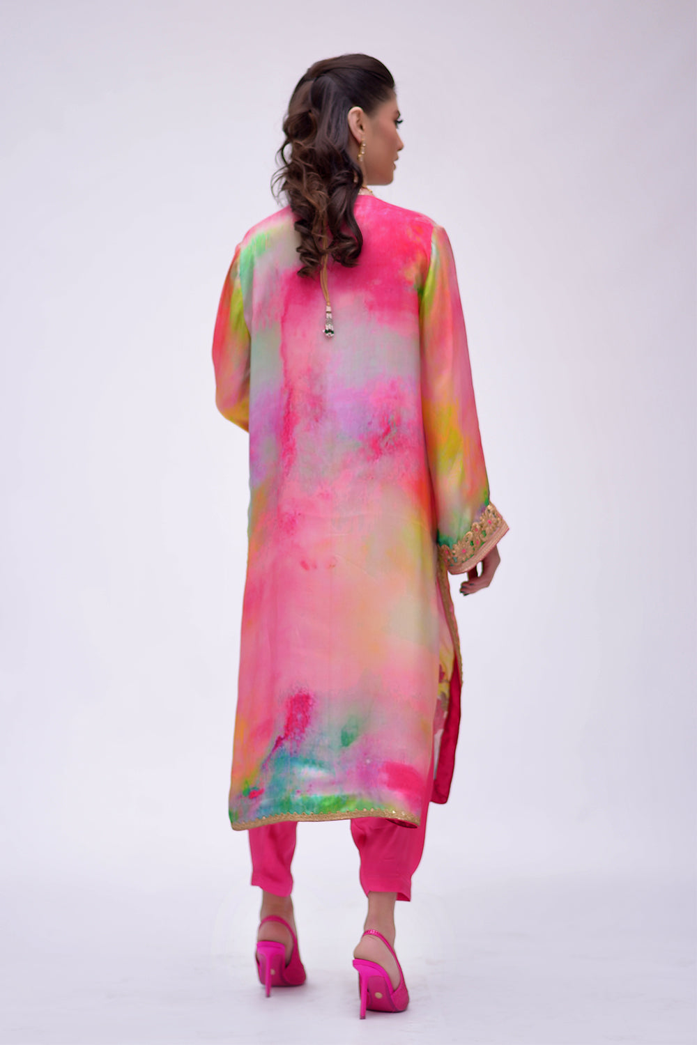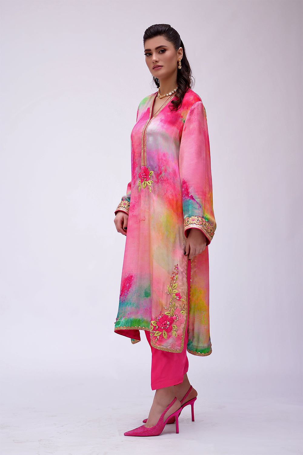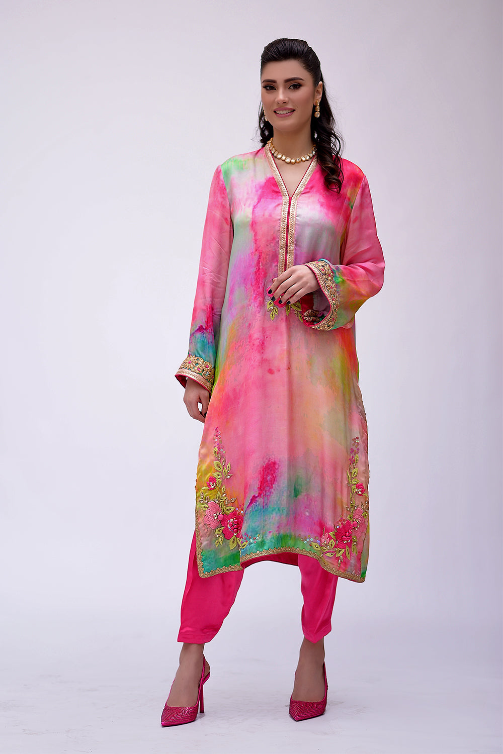 3 Piece suit, screen printed pure silk fabric with crushed dupatta embellished with tilla,dapka and zero sizes sequence, And Swarovski work.
