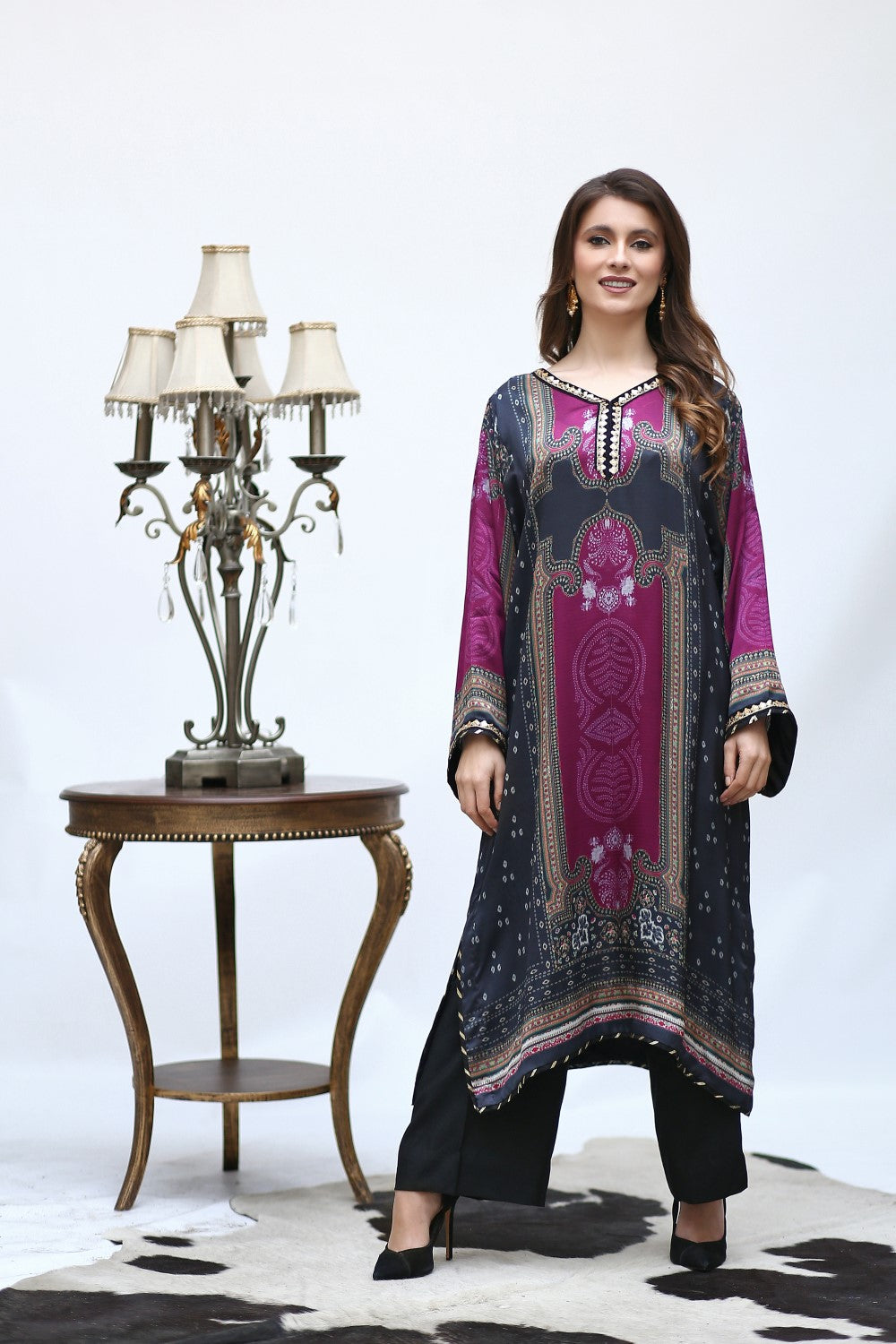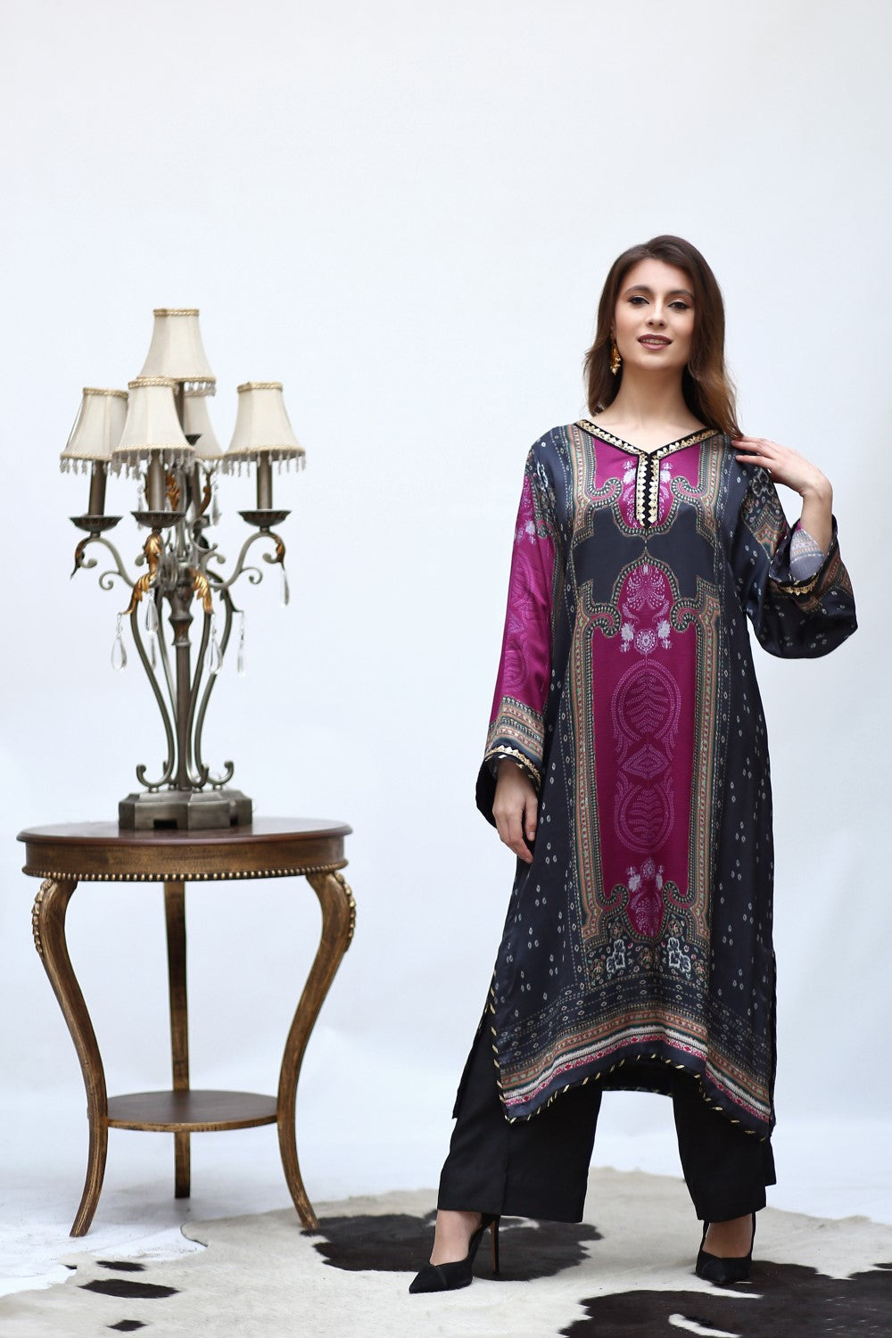 | Fabric: Digital Printed Chunri Silk Pieces: 1 pieces; Shirt Embelish With Beautiful Sequence Lace Note: The colours of the product may slightly vary due to different background lighting. |