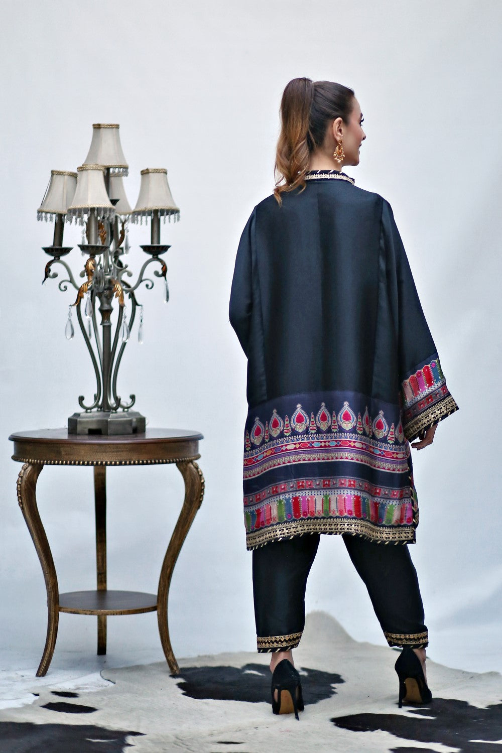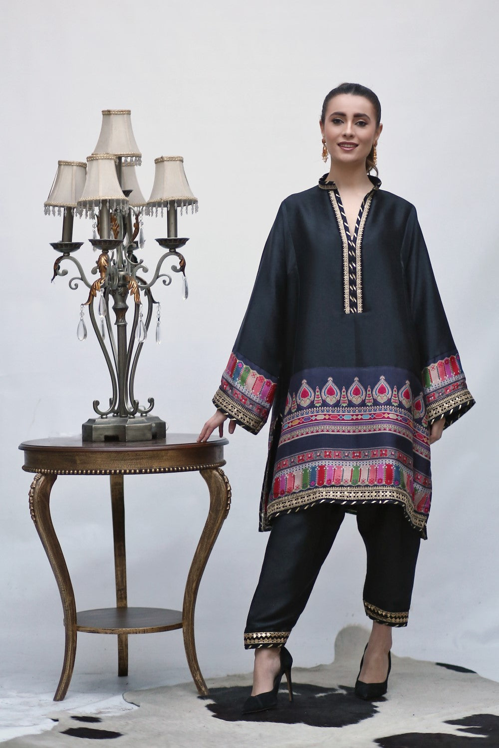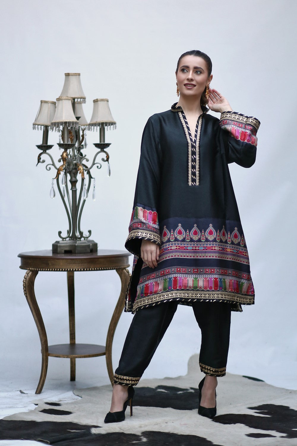| Fabric: Silk Pieces: 2 pieces; Shirt,Trouser Embelish With Digital Silk Borders & Sequence Lace Note: The colours of the product may slightly vary due to different background lighting. |