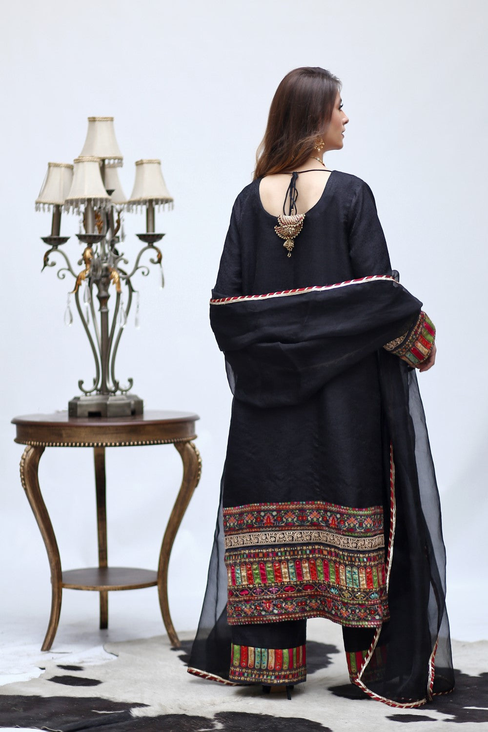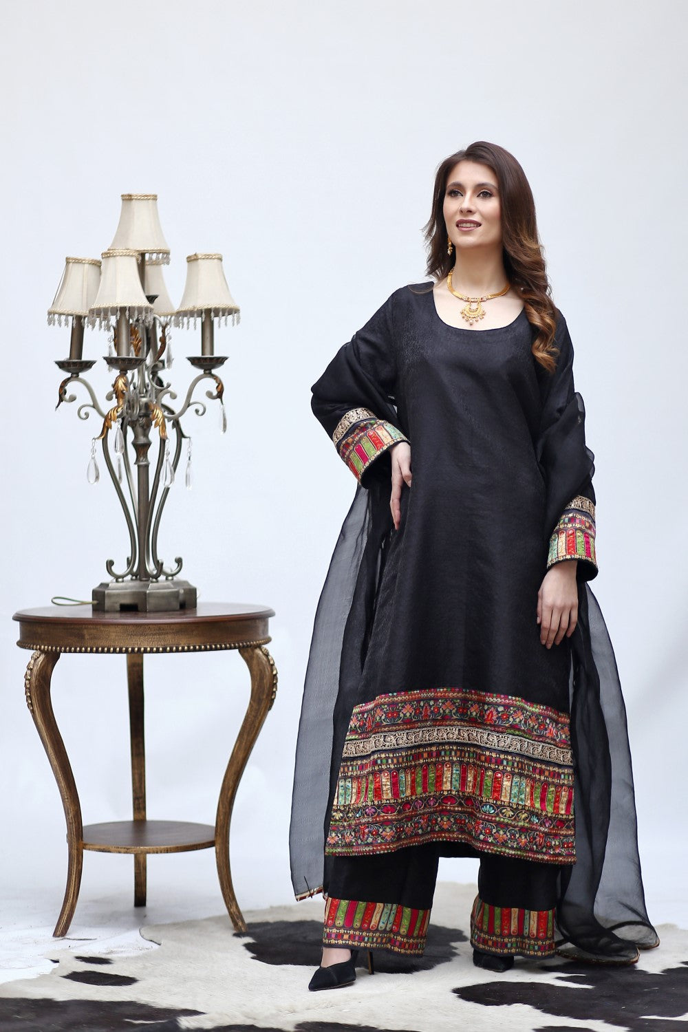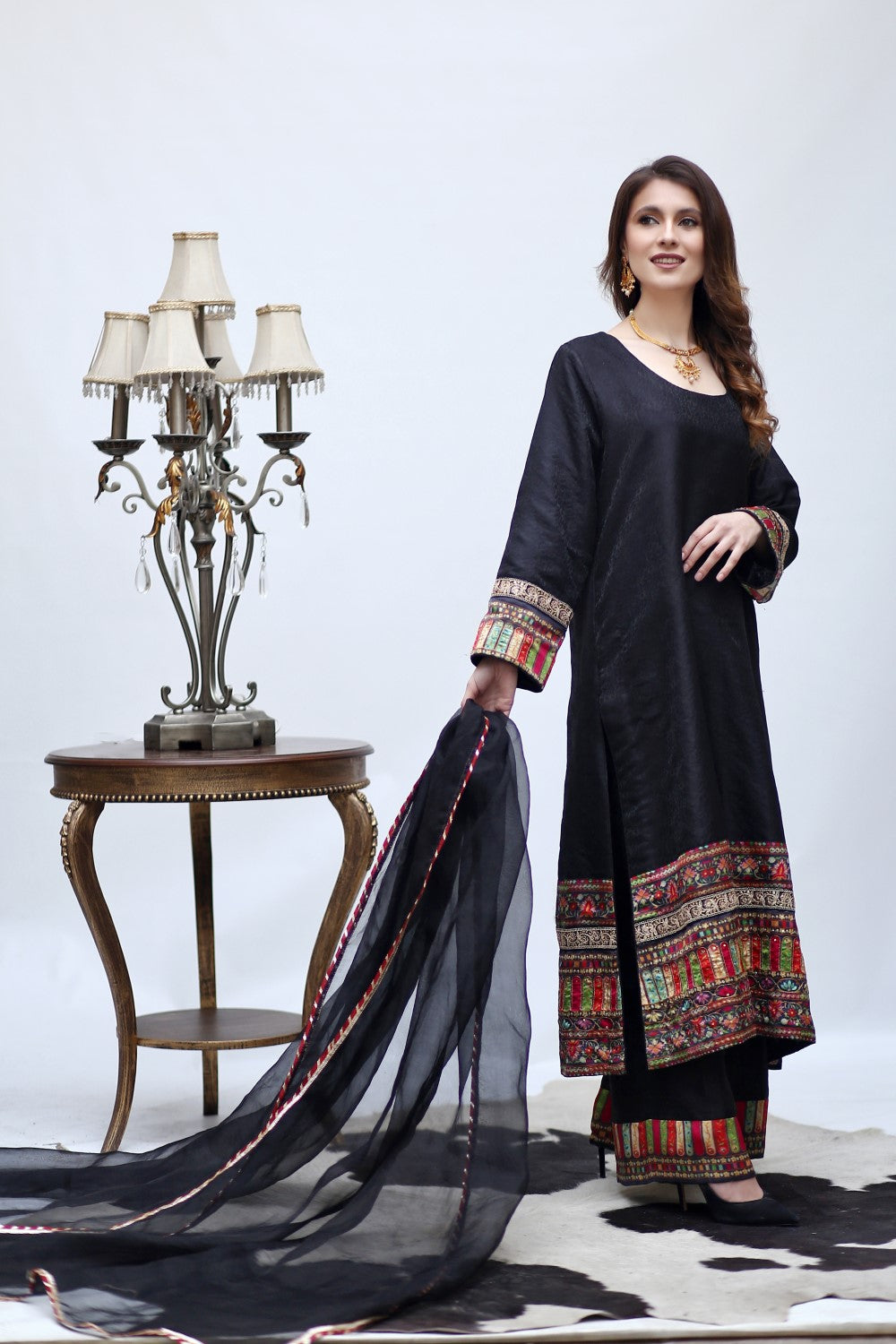 | Fabric: Tecture Self Jamawar Pieces: 3 pieces; Shirt, Dupatta & Trouser Embelish with Digital Silk Border and Sequence work Note: The colours of the product may slightly vary due to different background lighting. |