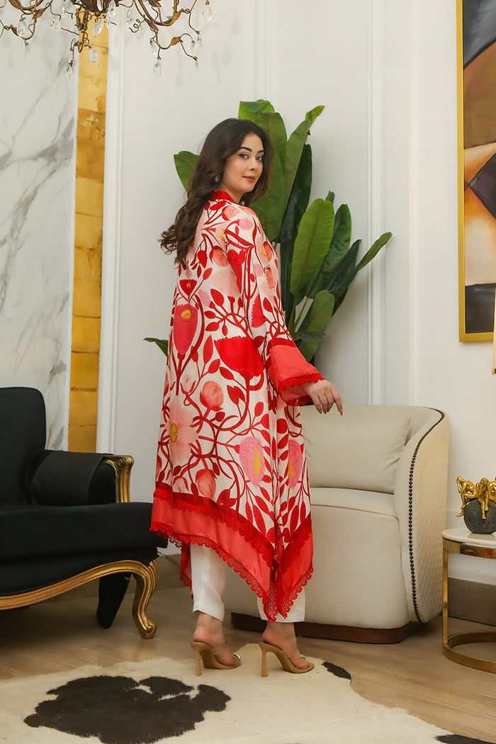 This summer-friendly shirt features a vibrant digital print and delicate lace trims, combining comfort with elegant style. Designed as a single-piece A-line shirt, it offers a flattering silhouette ideal for warm weather. Perfect for those seeking breathable fabric with a colorful, refined finish.