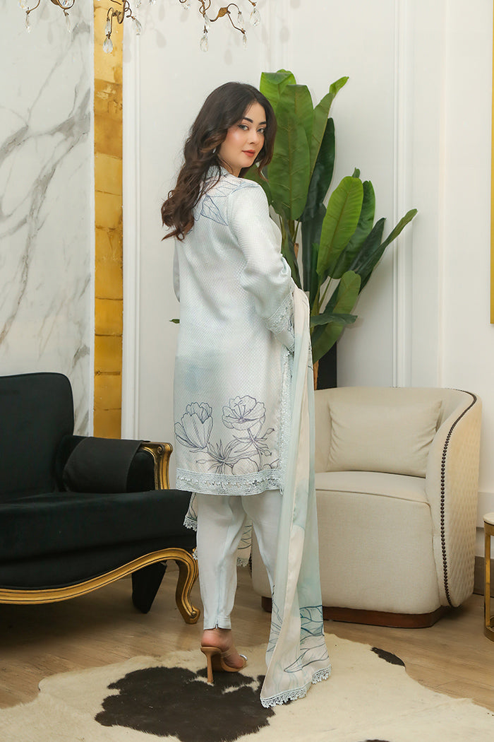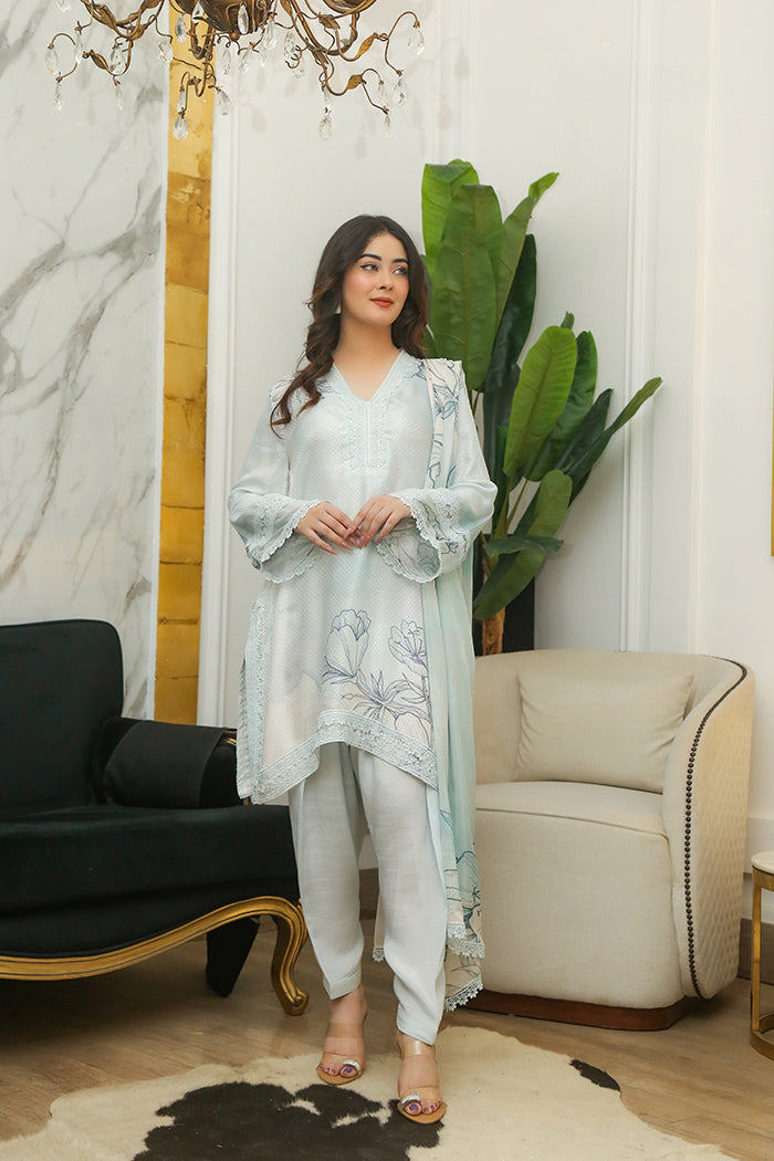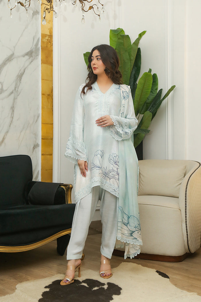 This elegant ensemble features a cotton viscose shirt paired with a luxurious silk dupatta, combining comfort with sophistication. The breathable cotton viscose fabric ensures ease of wear, while the silk dupatta adds a refined touch, perfect for both casual and formal occasions. Ideal for those seeking a blend of natural fibers and graceful style.