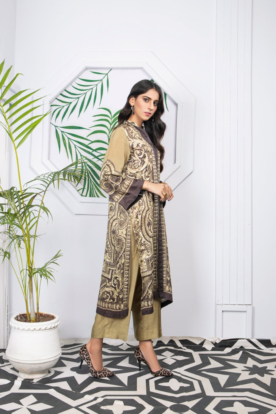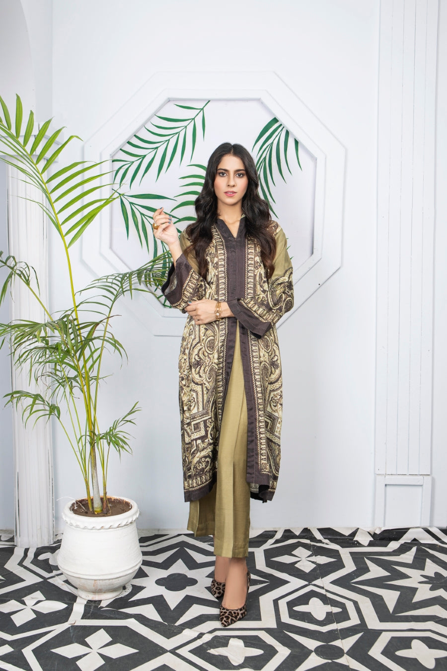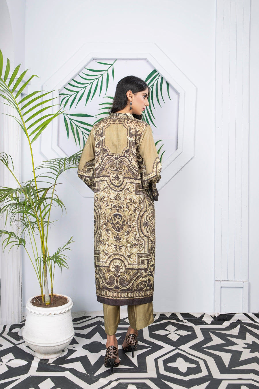 Glamorous winter silk two-piece outfits. Styled as a front open coat bearing ditital prints, this outfit is a must have in your wardrobe!