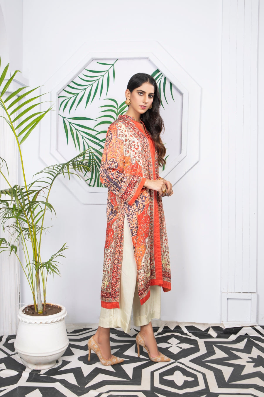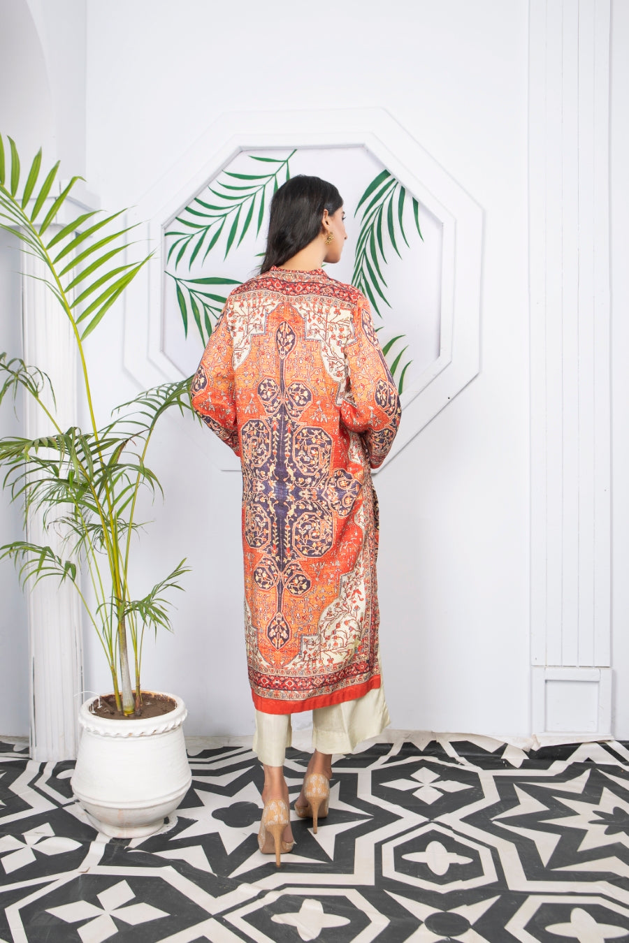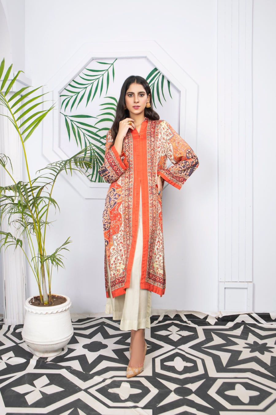 Glamorous winter silk two-piece outfits. Styled as a front open coat bearing ditital prints, this outfit is a must have in your wardrobe!