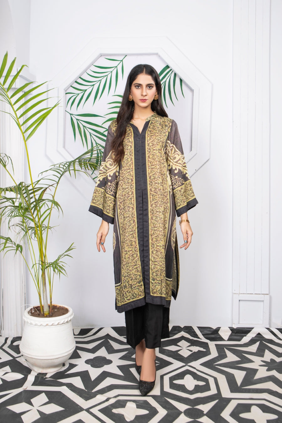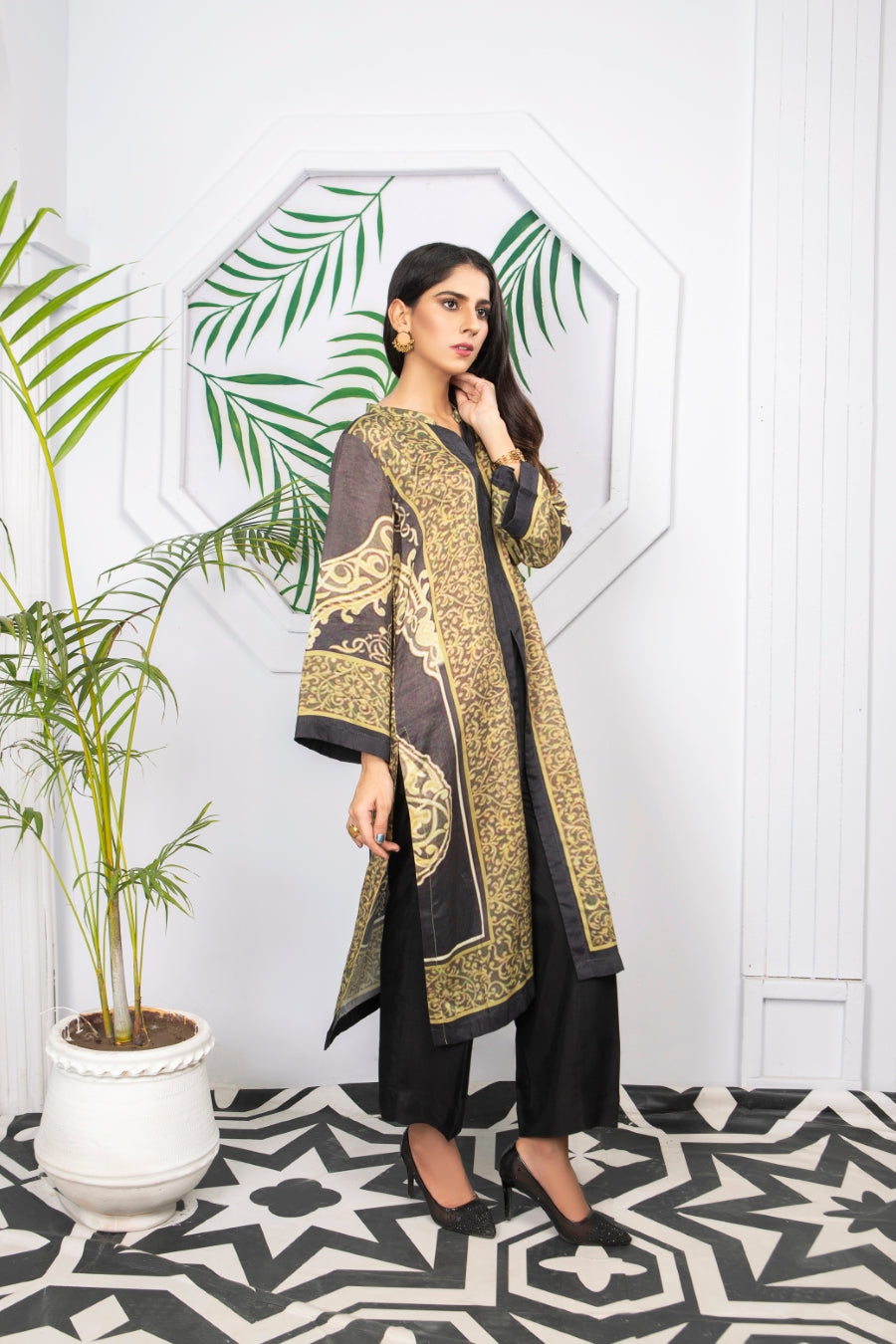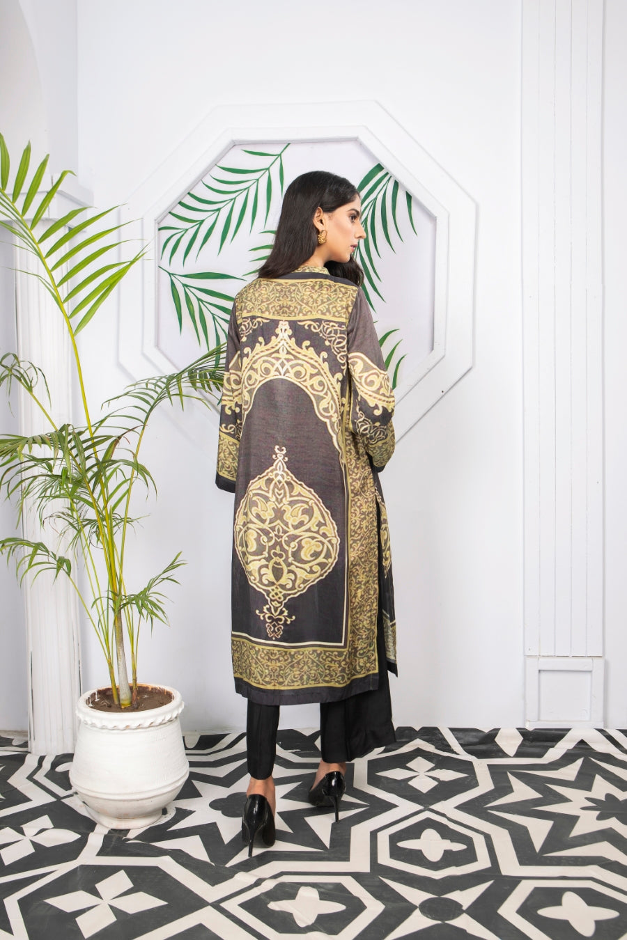 Glamorous winter silk two-piece outfits. Styled as a front open coat bearing ditital prints, this outfit is a must have in your wardrobe!