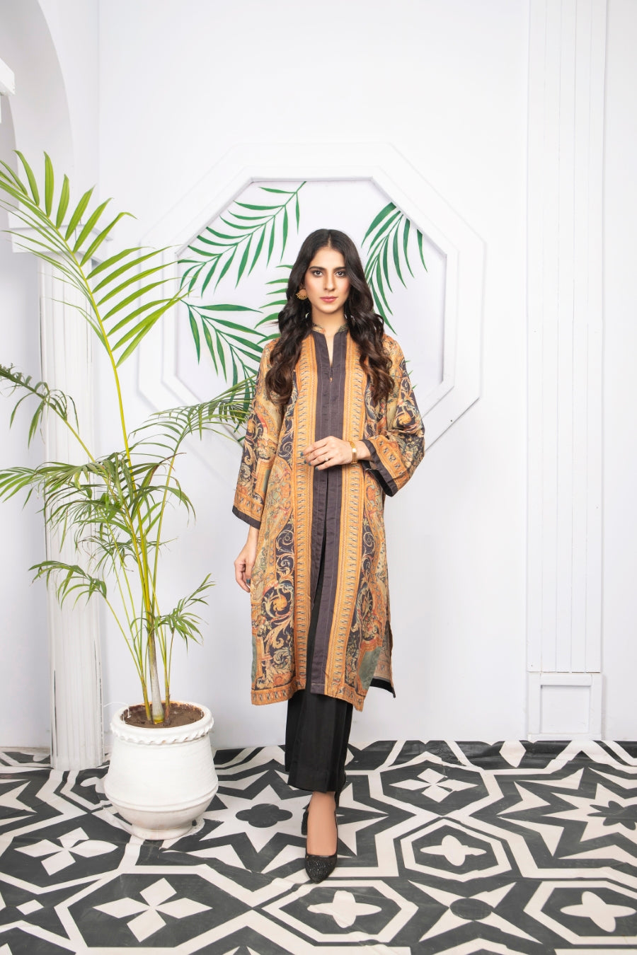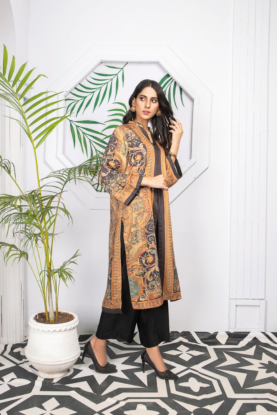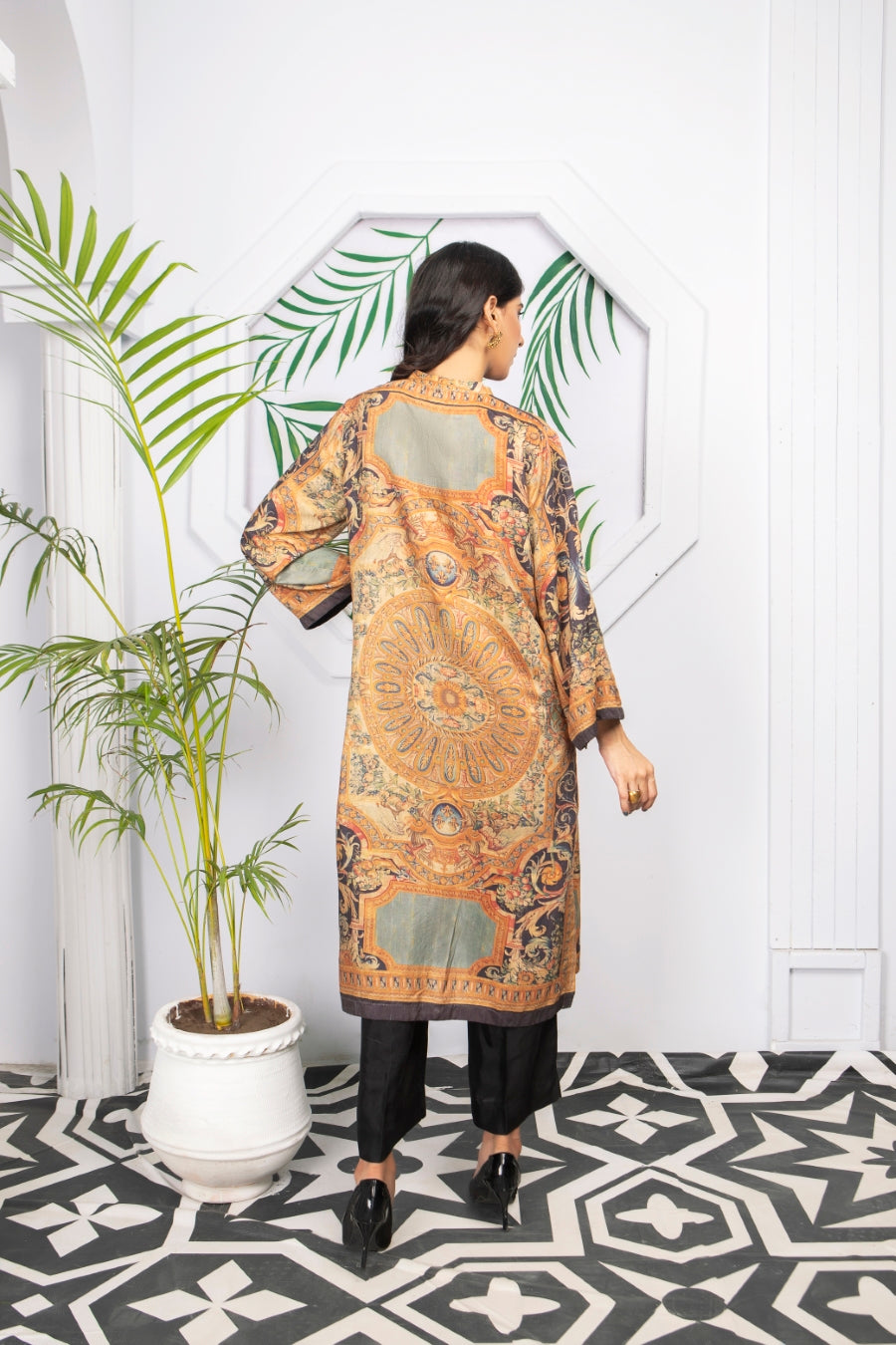 Glamorous winter silk two-piece outfits. Styled as a front open coat bearing ditital prints, this outfit is a must have in your wardrobe!