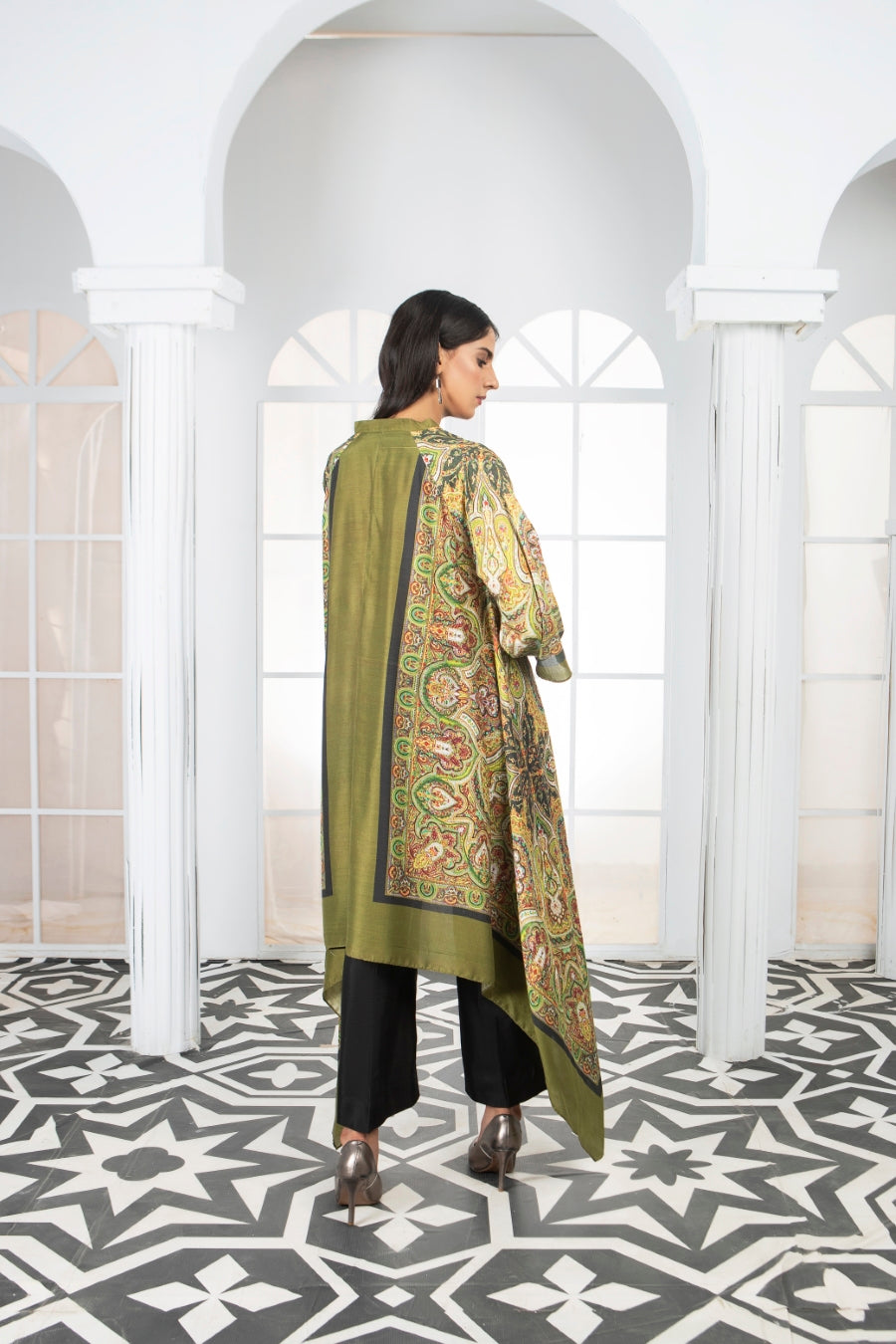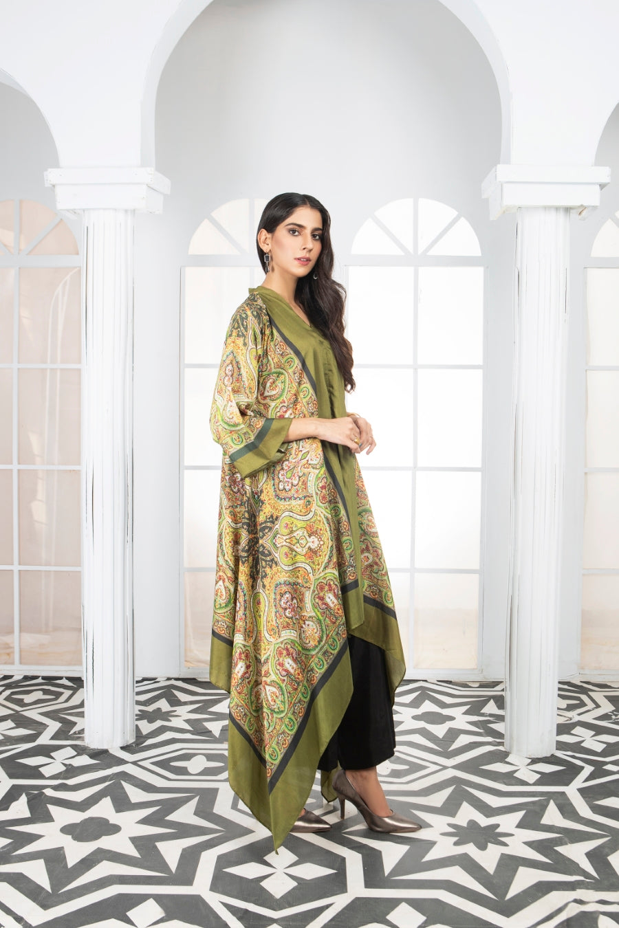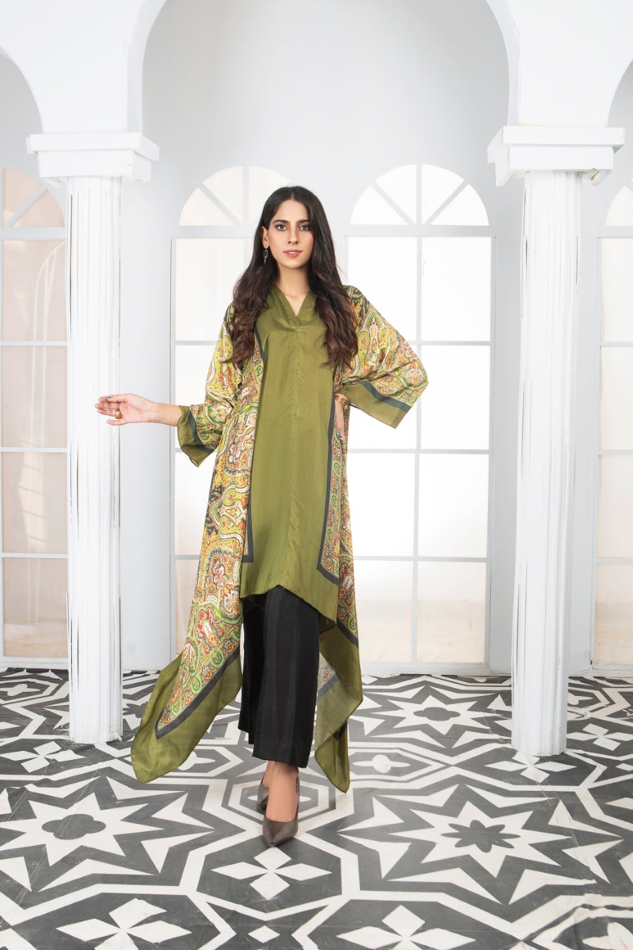 A stunning single piece bias cut kaftan shirt, made from the finest winter silk. The kaftan is adorned with digital prints that add to its elegance.