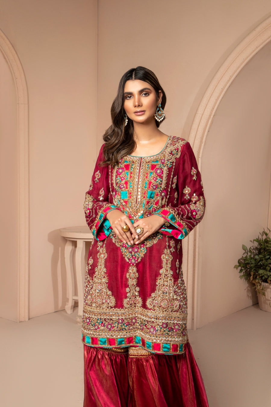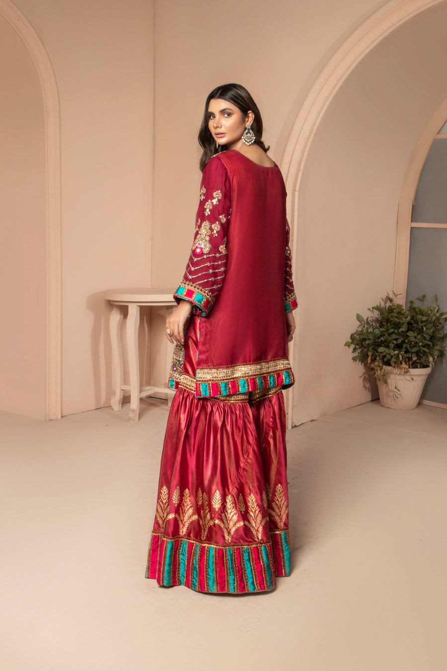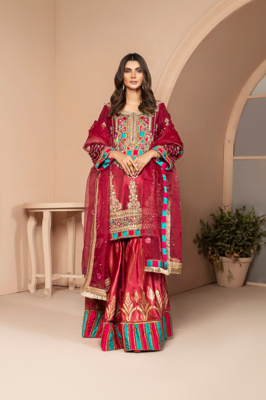 Scarlet is a striking red ensemble that features a gorgeous silk shirt that is heavily embellished with mirror and dabka work, with accents of turquoise to create a contrast. The outfit is paired with silk sharara pants that are block printed and stylized at the ends. The dupatta is a beautiful red organza with kiran and contrasting turquoise accents along the borders.
