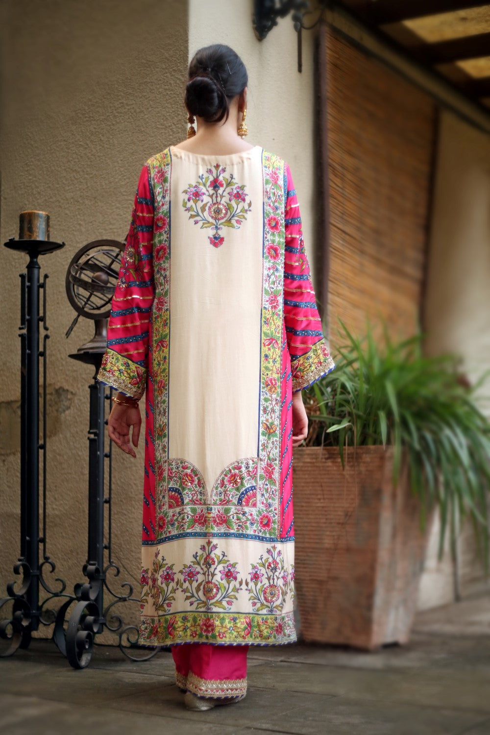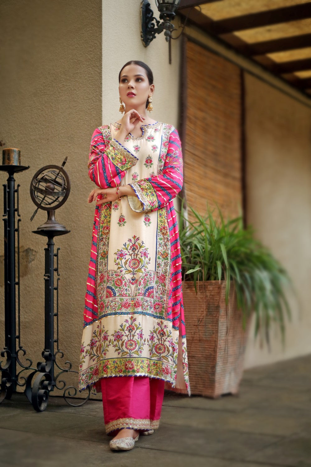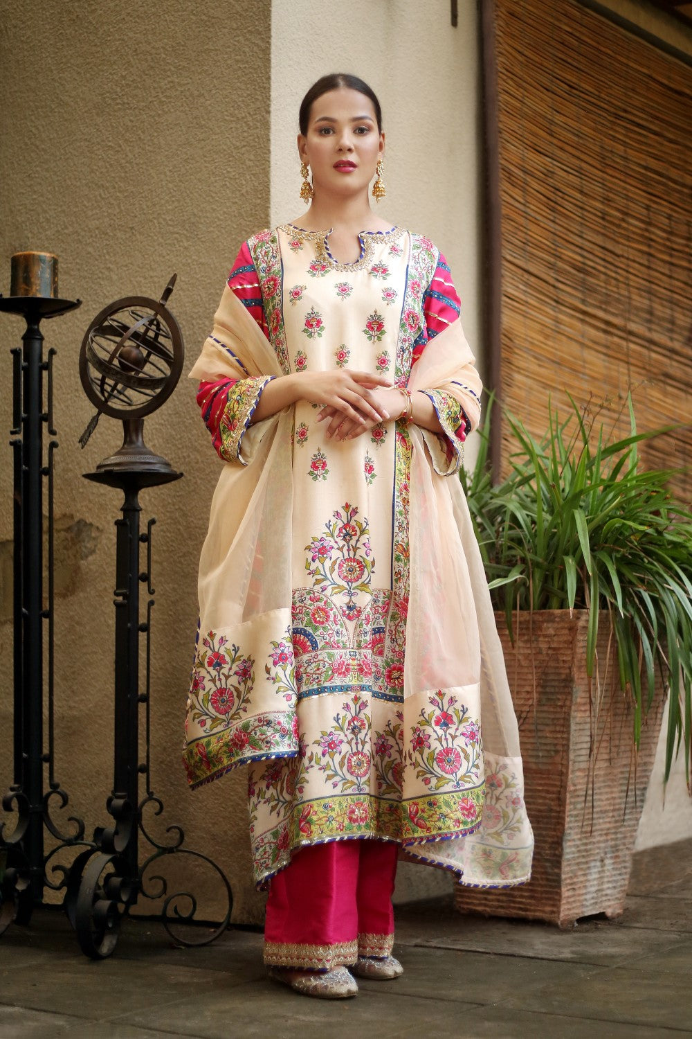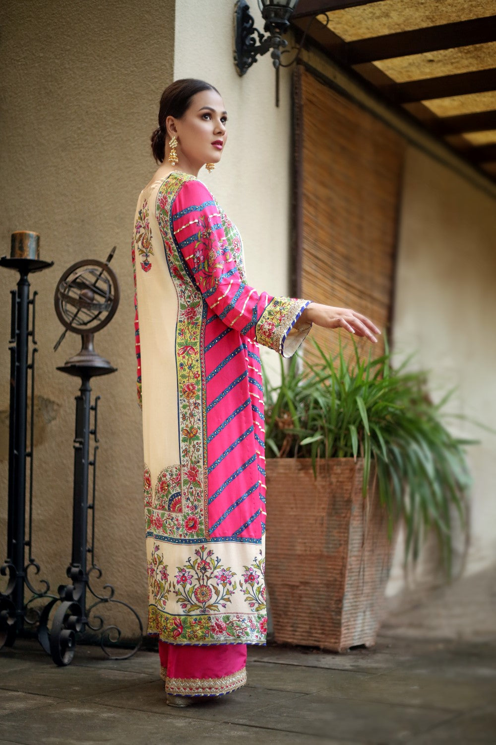 printed 3 psc silk suit with organza dupata embellished with beautiful gota and zardozi work