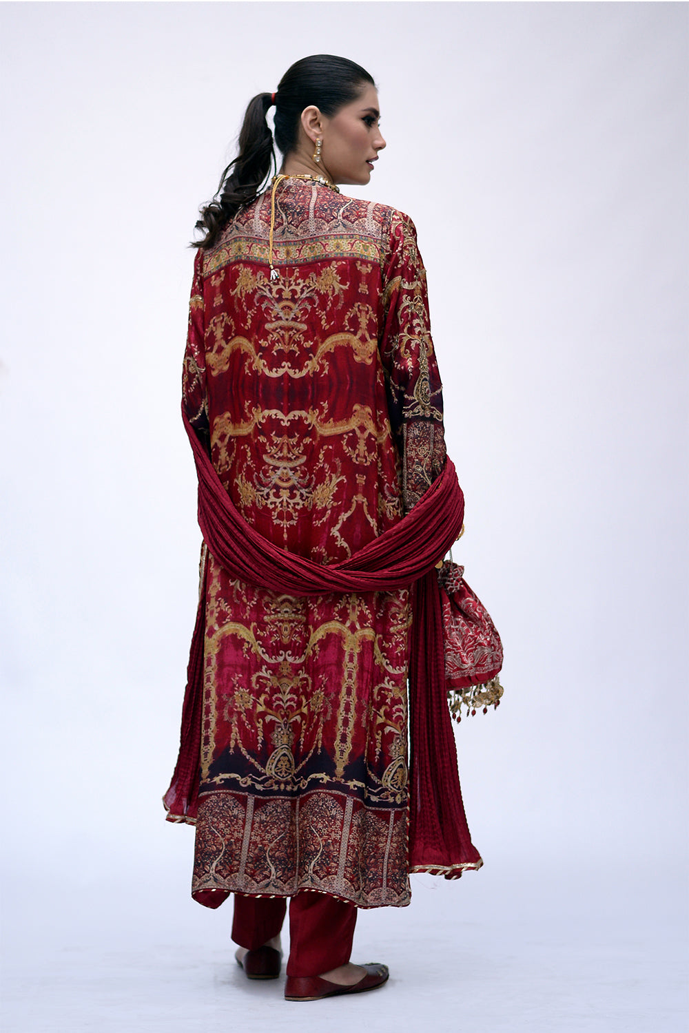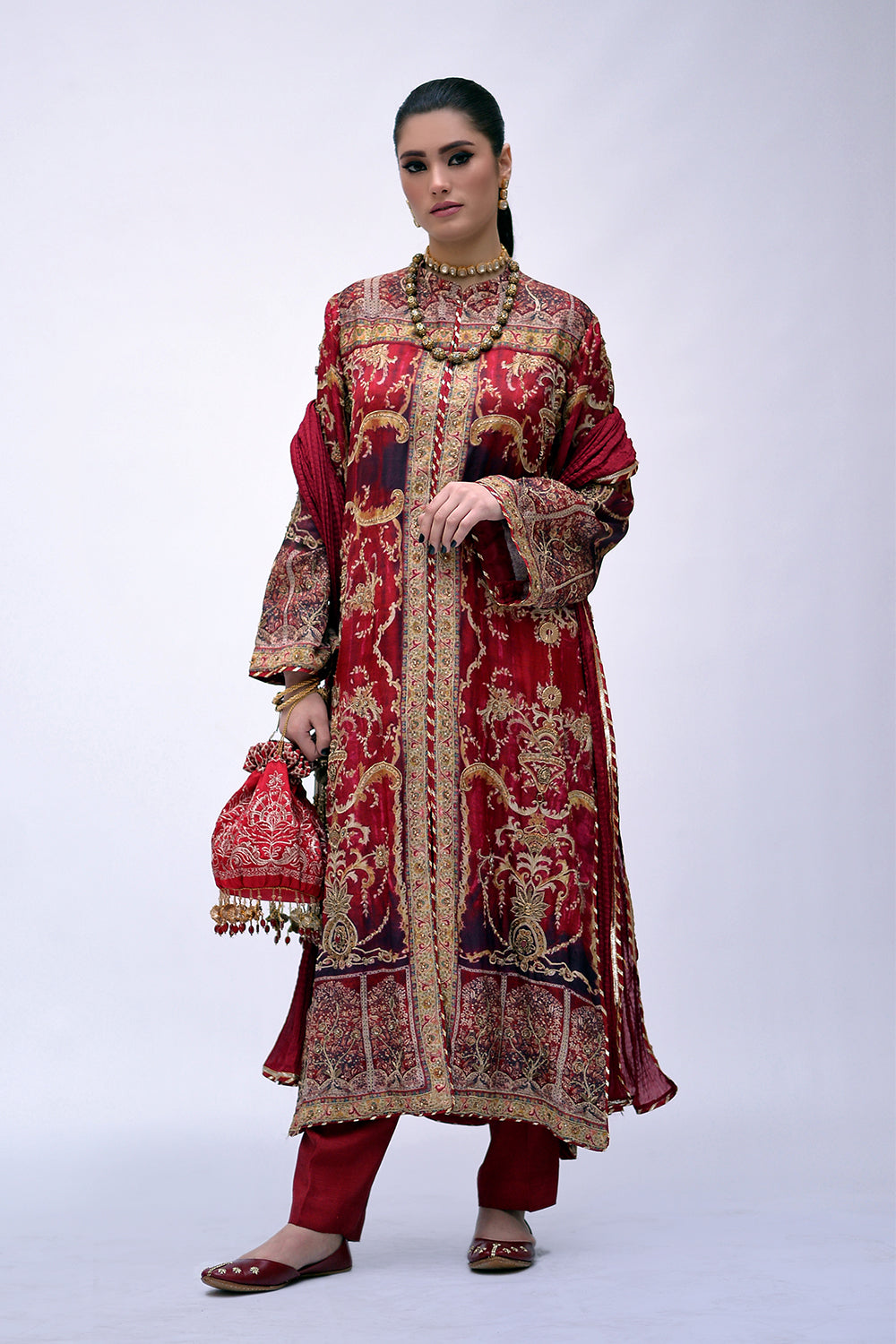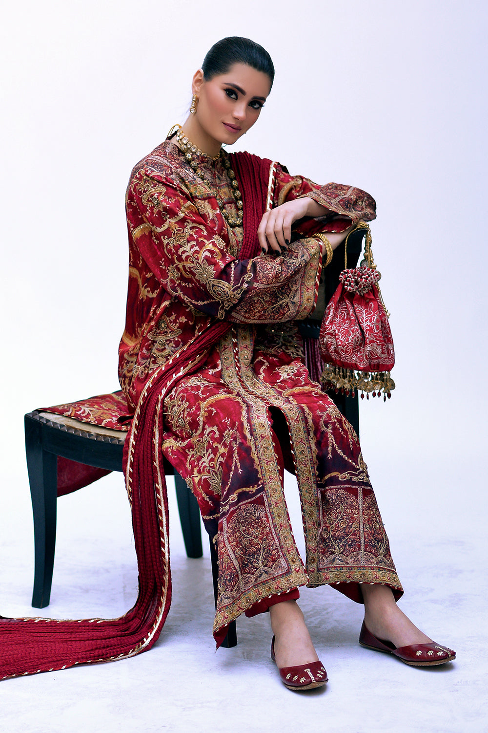 3 Piece suit, screen printed pure silk fabric with crushed dupatta embellished with tilla,dapka and zero sizes sequence, And Swarovski work