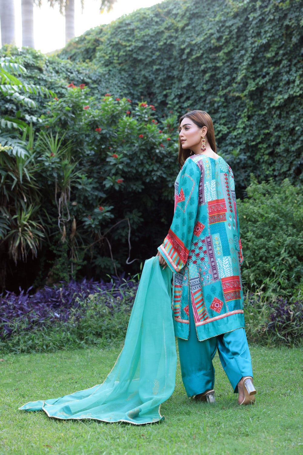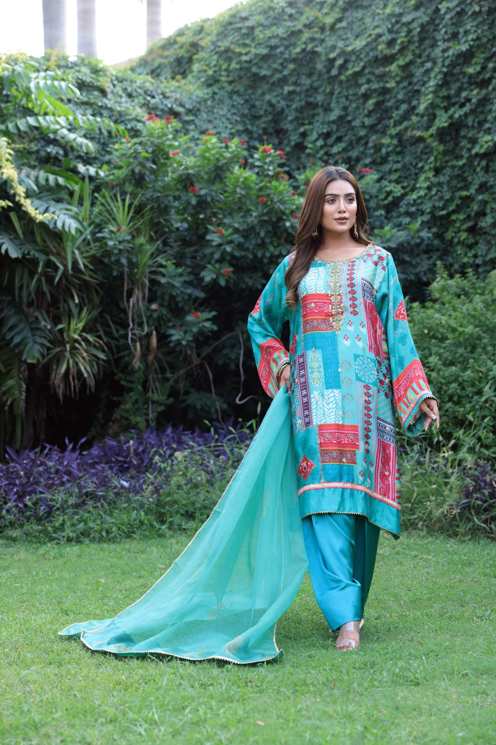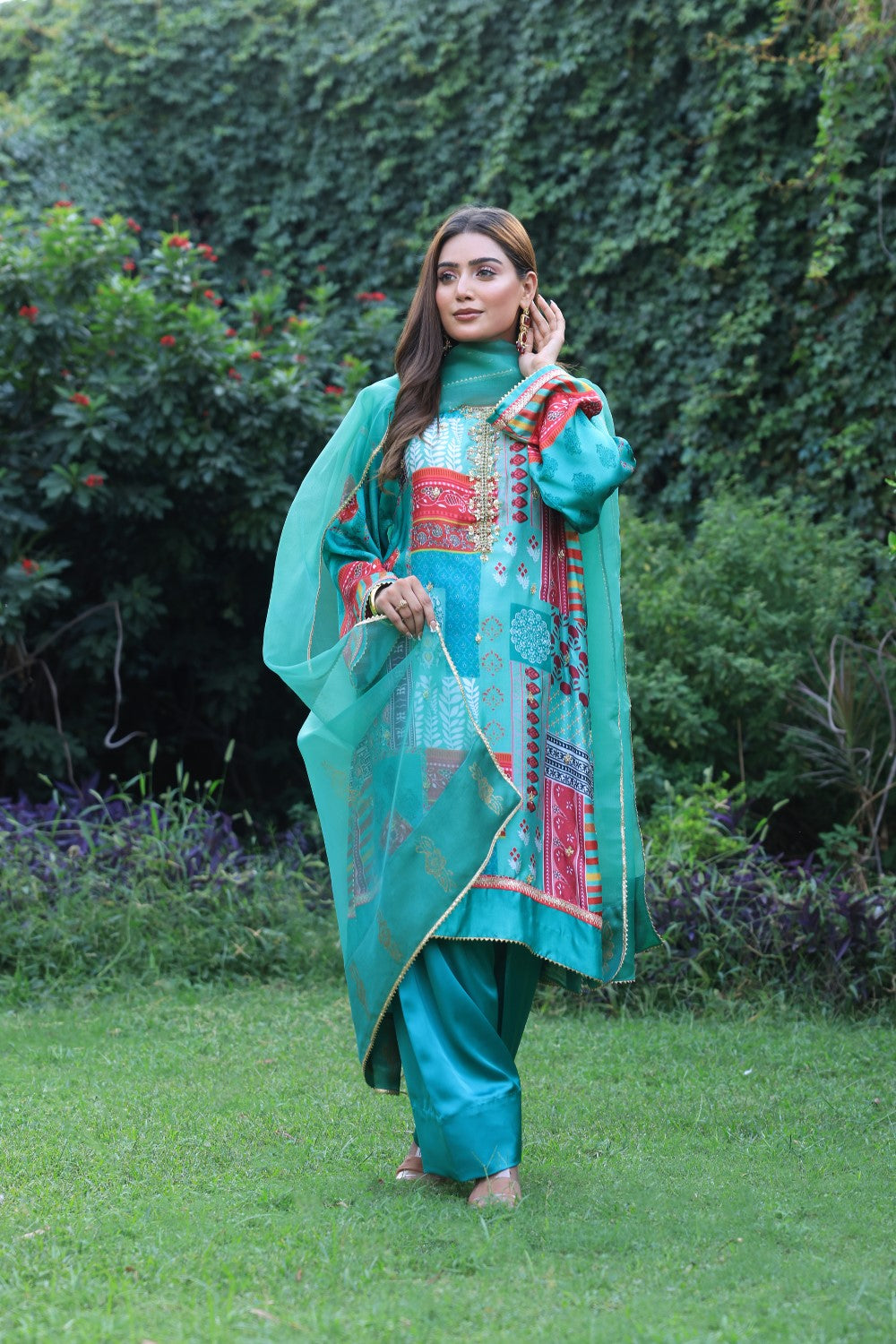 3 Piece Beautiful Printed Pure Silk Shirts With Gotta And Hand Work, Organza Dupatta And Loose Shalwar