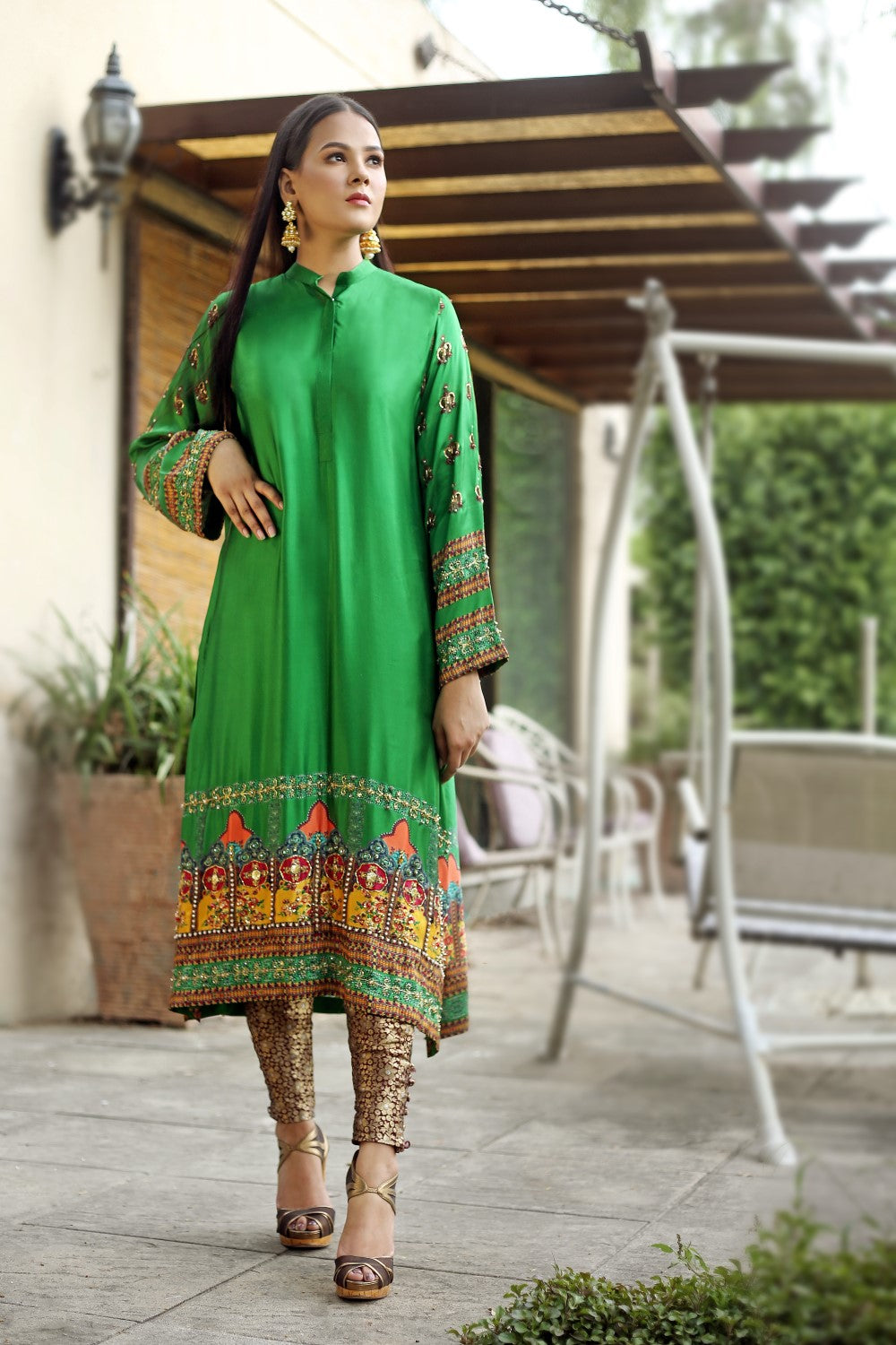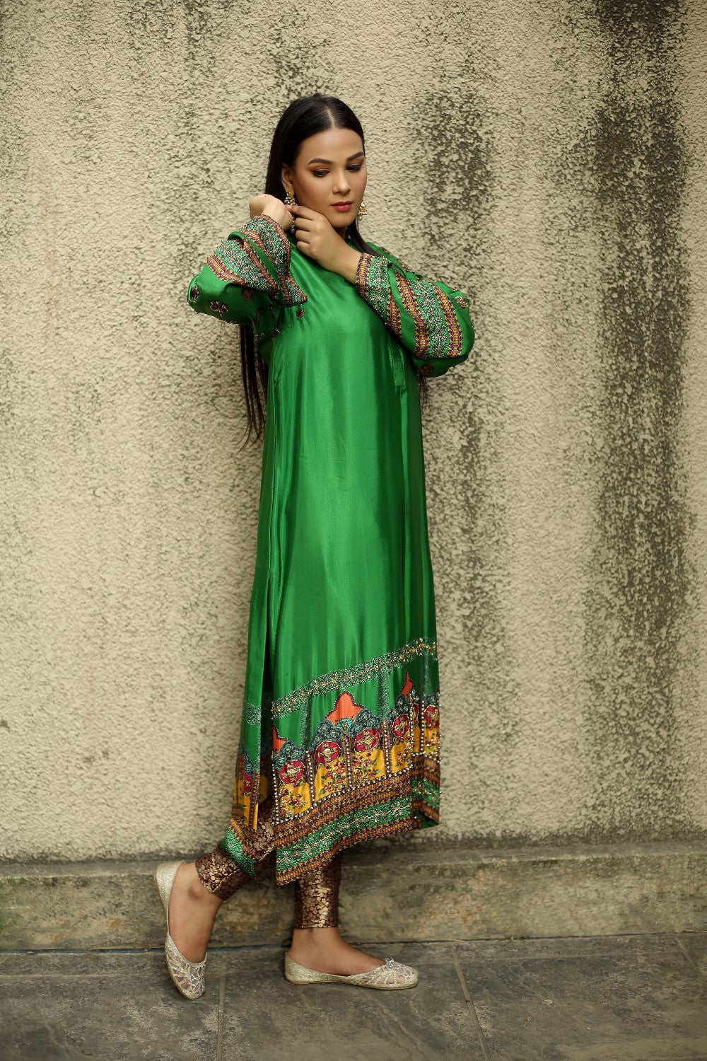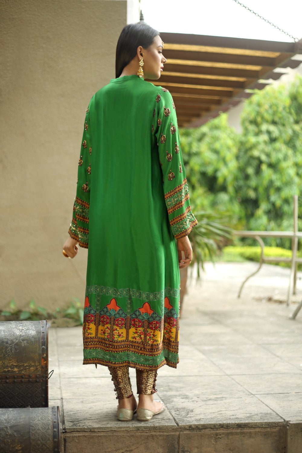Green silk kurta beautifully printed and embellished with zardozi work