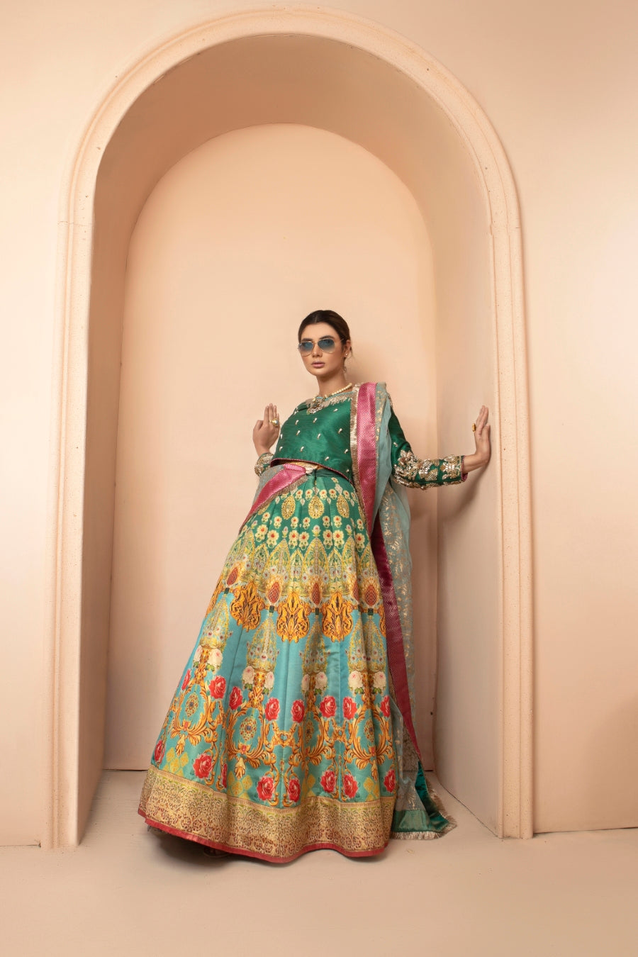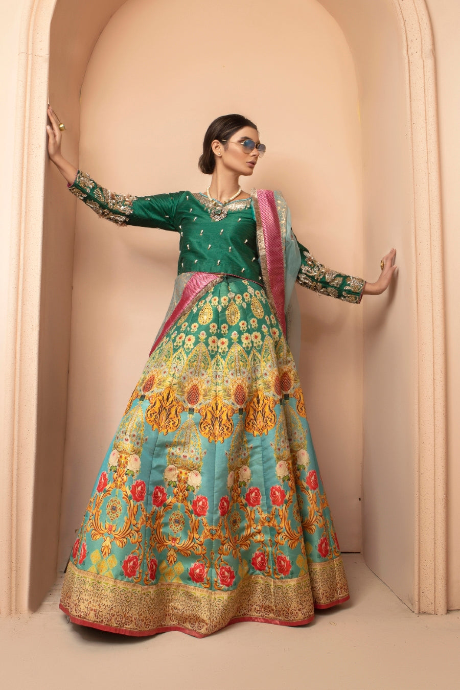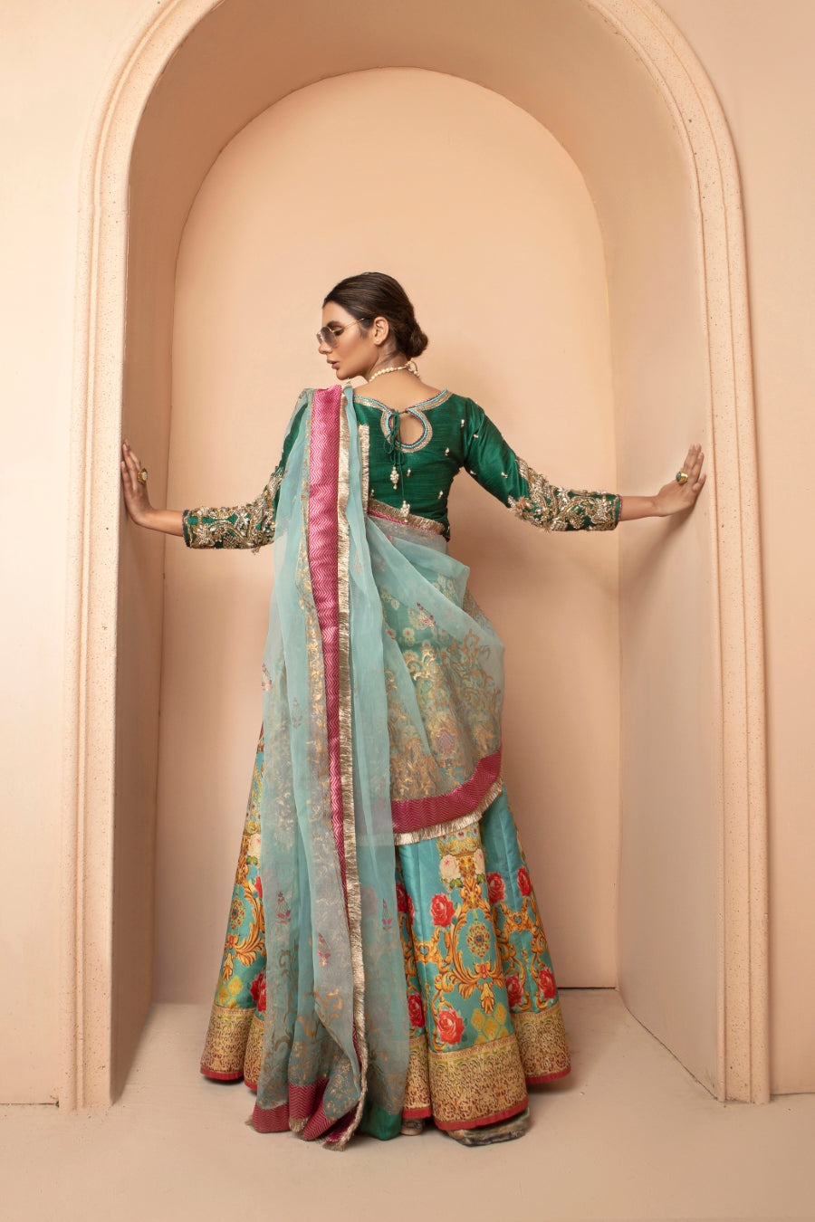 Add some flair to your wedding ensembles this season! A gorgeous green raw silk choli with intricately done dabka and stone work along the neckline, back and sleeves. The lehnga is digitally printed raw silk and the outfit is paired with a stunning sky blue block printed organza dupatta with pink jamawar and kiran on the borders.